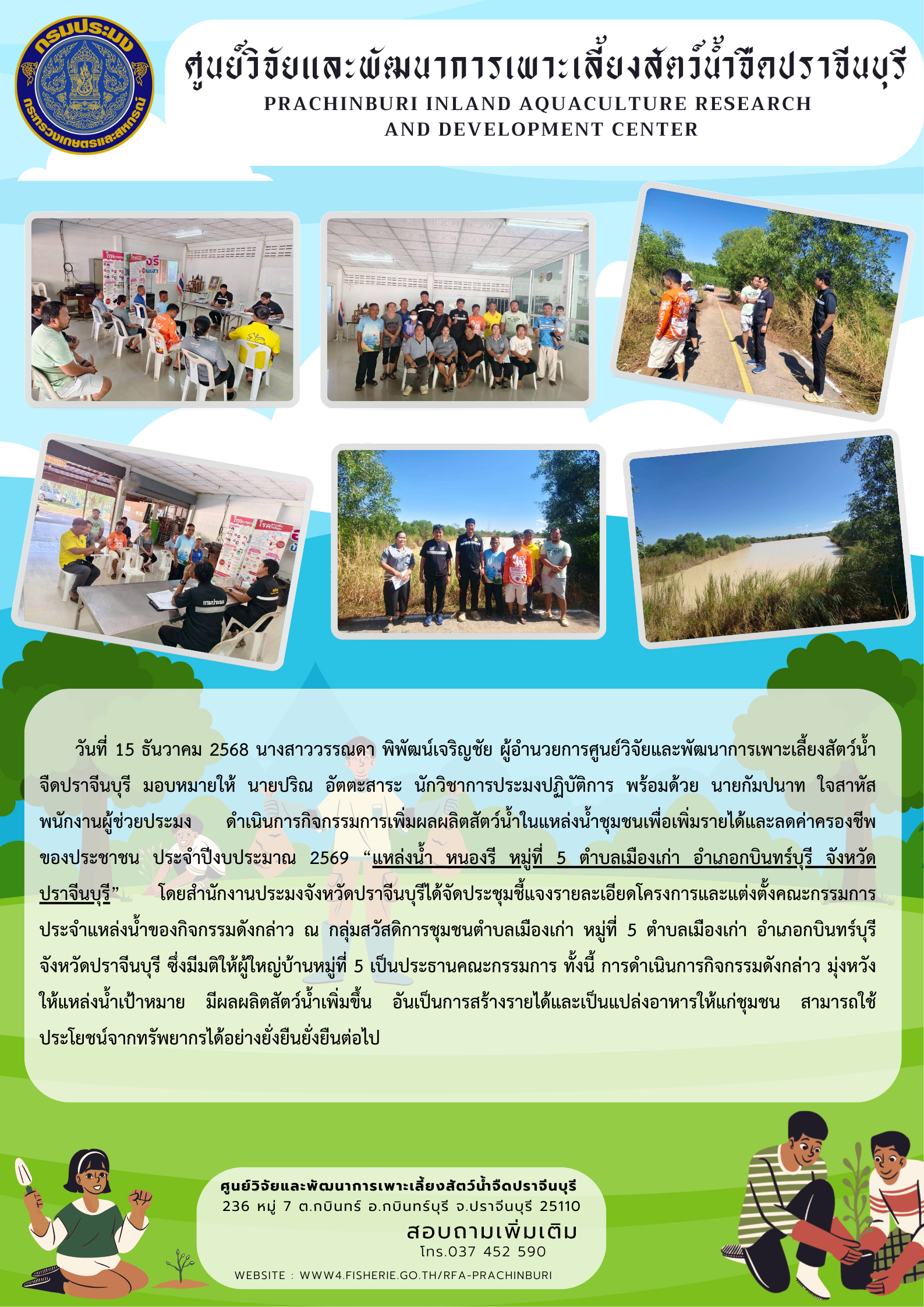 วันที่ 15 ธันวาคม 2568 นางสาววรรณดา พิพัฒน์เจริญชัย ผู้อำนวยการศูนย์วิจัยและพัฒนาการเพาะเลี้ยงสัตว์น้ำจืดปราจีนบุรี มอบหมายให้ นายปริณ อัตตะสาระ นักวิชาการประมงปฏิบัติการ พร้อมด้วย นายกัมปนาท ใจสาหัส พนักงานผู้ช่วยประมง ดำเนินการกิจกรรมการเพิ่มผลผลิตสัตว์น้ำในแหล่งน้ำชุมชนเพื่อเพิ่มรายได้และลดค่าครองชีพของประชาชน ประจำปีงบประมาณ 2569 “แหล่งน้ำ หนองรี หมู่ที่ 5 ตำบลเมืองเก่า อำเภอกบินทร์บุรี จังหวัดปราจีนบุรี” โดยสำนักงานประมงจังหวัดปราจีนบุรีได้จัดประชุมชี้แจงรายละเอียดโครงการและแต่งตั้งคณะกรรมการประจำแหล่งน้ำของกิจกรรมดังกล่าว ณ กลุ่มสวัสดิการชุมชนตำบลเมืองเก่า หมู่ที่ 5 ตำบลเมืองเก่า อำเภอกบินทร์บุรี จังหวัดปราจีนบุรี ซึ่งมีมติให้ผู้ใหญ่บ้านหมู่ที่ 5 เป็นประธานคณะกรรมการ ทั้งนี้ การดำเนินการกิจกรรมดังกล่่าว มุ่งหวังให้แหล่งน้ำเป้าหมาย มีผลผลิตสัตว์น้ำเพิ่มขึ้น อันเป็นการสร้างรายได้และเป็นแปล่งอาหารให้แก่ชุมชน สามารถใช้ประโยชน์จากทรัพยากรได้อย่างยั่งยืนยั่งยืนต่อไป