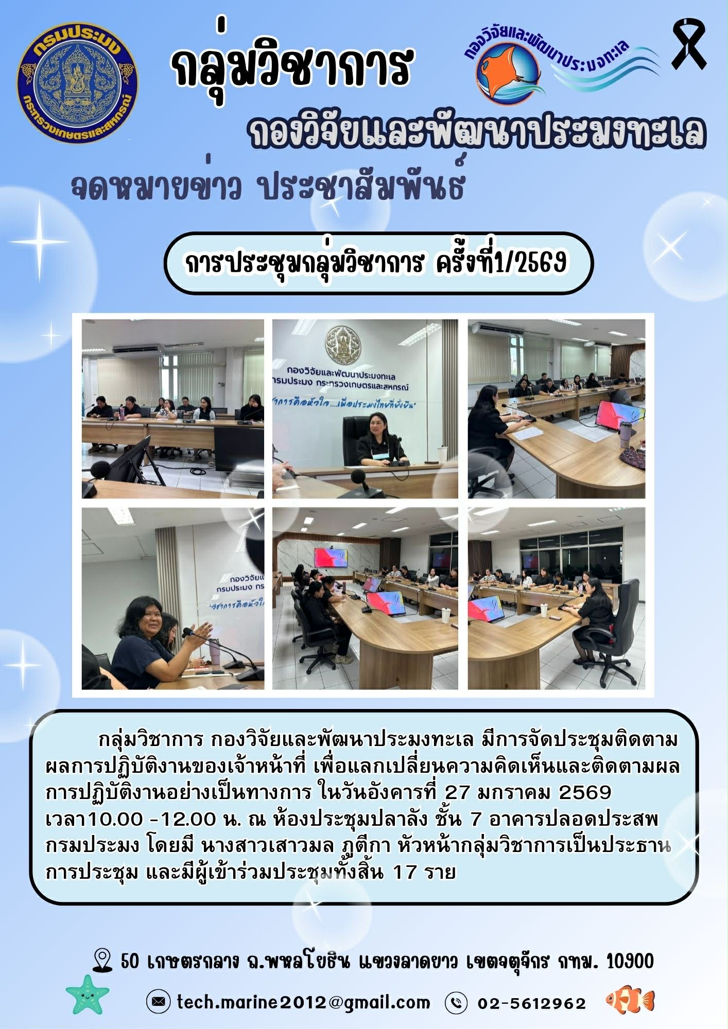 การประชุมติดตามผลการปฏิบัติงานของเจ้าหน้าที่กลุ่มวิชาการ กองวิจัยและพัฒนาประมงทะเล ครั้งที่ 1/2569
