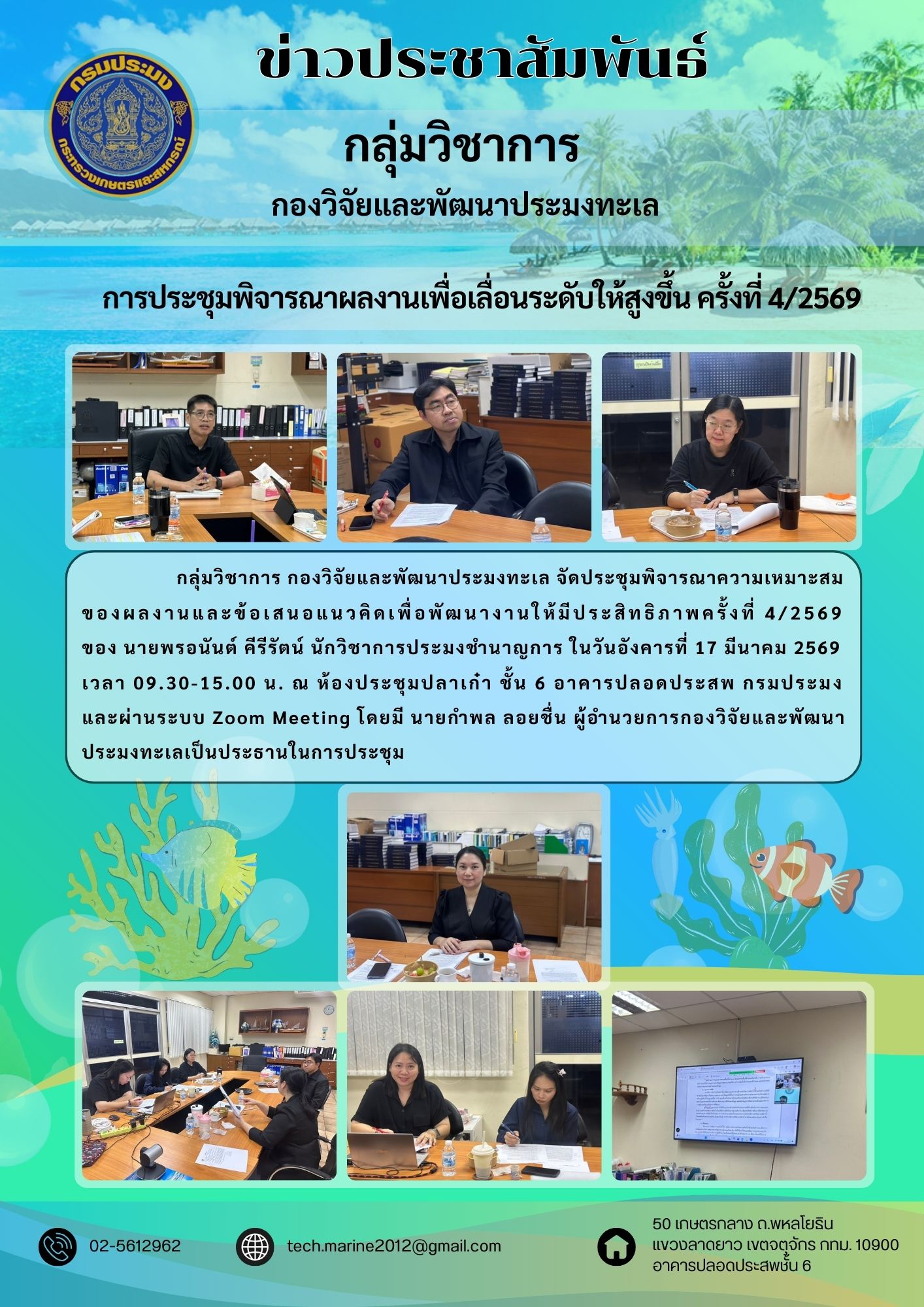 กลุ่มวิชาการ กองวิจัยและพัฒนาประมงทะเล จัดประชุมพิจารณาความเหมาะสม ของผลงานและข้อเสนอแนวคิดเพื่อพัฒนางานให้มีประสิทธิภาพครั้งที่ 4/2569 ของ นายพรอนันต์ คีรีรัตน์