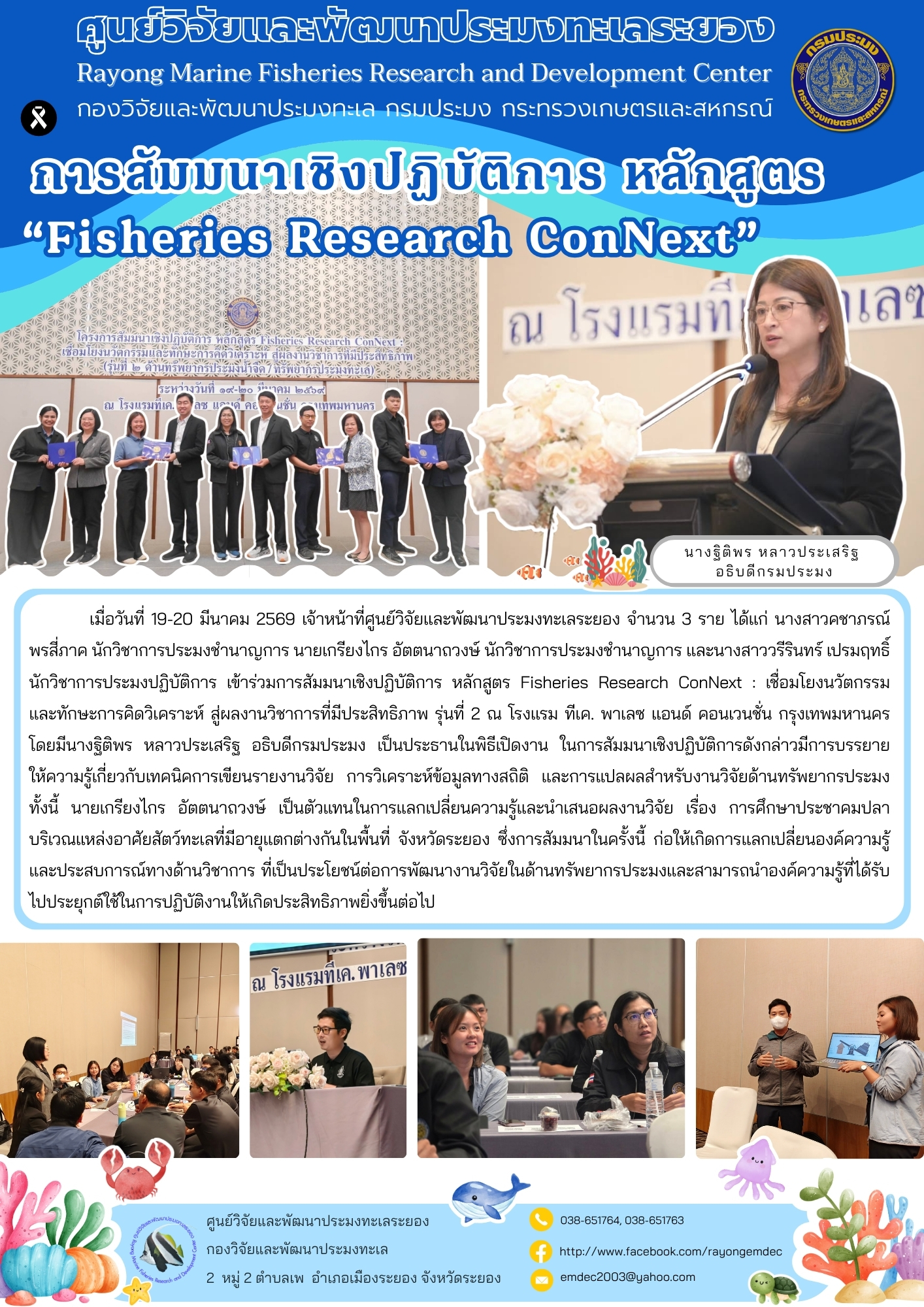 เมื่อวันที่ 19-20 มีนาคม 2569 เจ้าหน้าที่ศูนย์วิจัยและพัฒนาประมงทะเลระยอง จำนวน 3 ราย ได้แก่ นางสาวคชาภรณ์ พรสี่ภาค นักวิชาการประมงชำนาญการ นายเกรียงไกร อัตตนาถวงษ์ นักวิชาการประมงชำนาญการ และนางสาววรีรินทร์ เปรมฤทธิ์ นักวิชาการประมงปฏิบัติการ เข้าร่วมการสัมมนาเชิงปฏิบัติการ หลักสูตร Fisheries Research ConNext: เชื่อมโยงนวัตกรรม และทักษะการคิดวิเคราะห์ สู่ผลงานวิชาการที่มีประสิทธิภาพ รุ่นที่ 2 ณ โรงแรม ทีเค. พาเลซ แอนด์ คอนเวนชั่น กรุงเทพมหานคร โดยมีนางฐิติพร หลาวประเสริฐ อธิบดีกรมประมง เป็นประธานเปิดงานสัมมนา