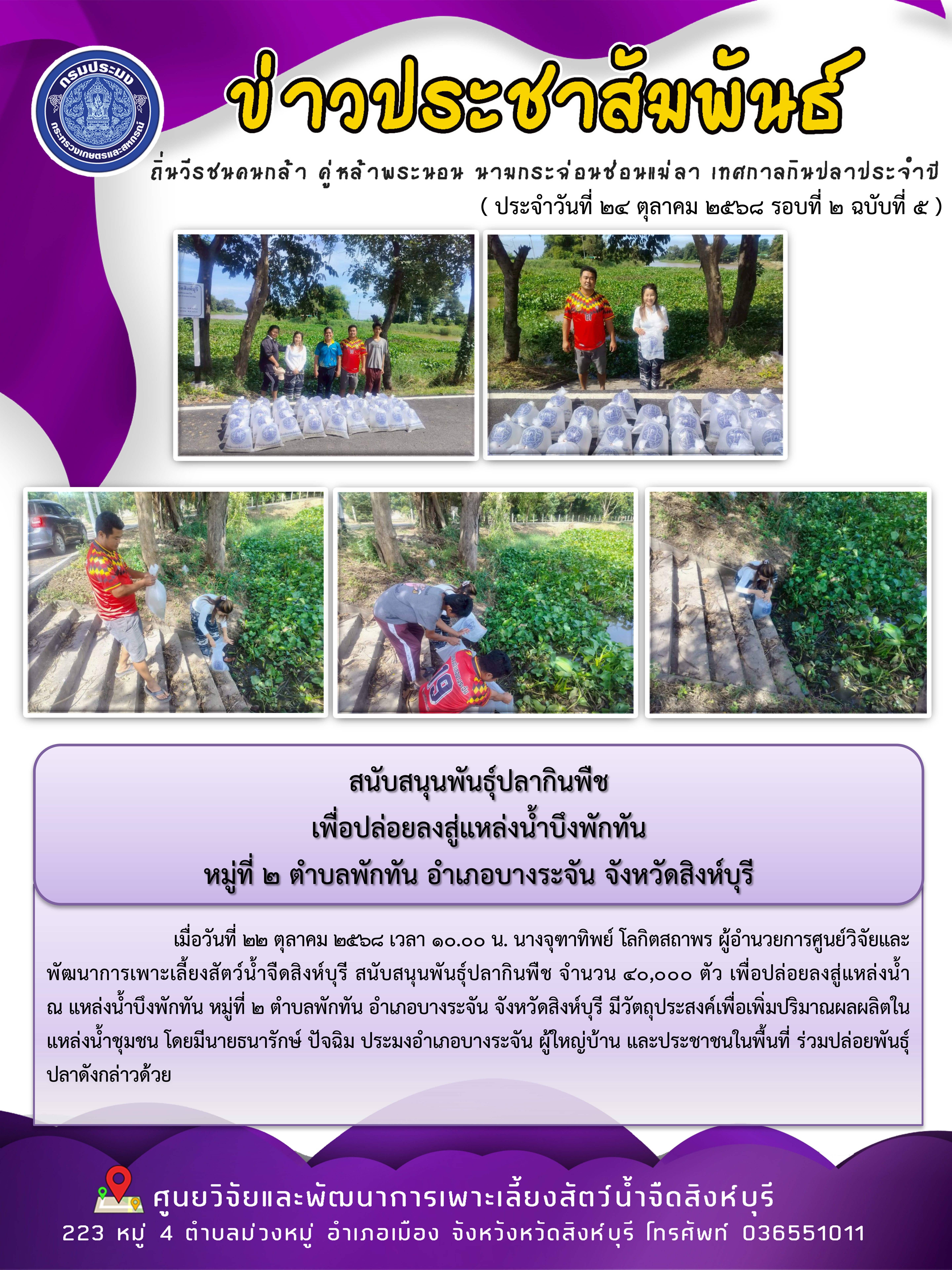 สนับสนุนพันธุ์ปลากินพืช เพื่อปล่อยลงสู่แหล่งน้ำบึงพักทัน หมู่ที่ 2 ตำบลพักทัน อำเภอบางระจัน จังหวัดสิงห์บุรี
