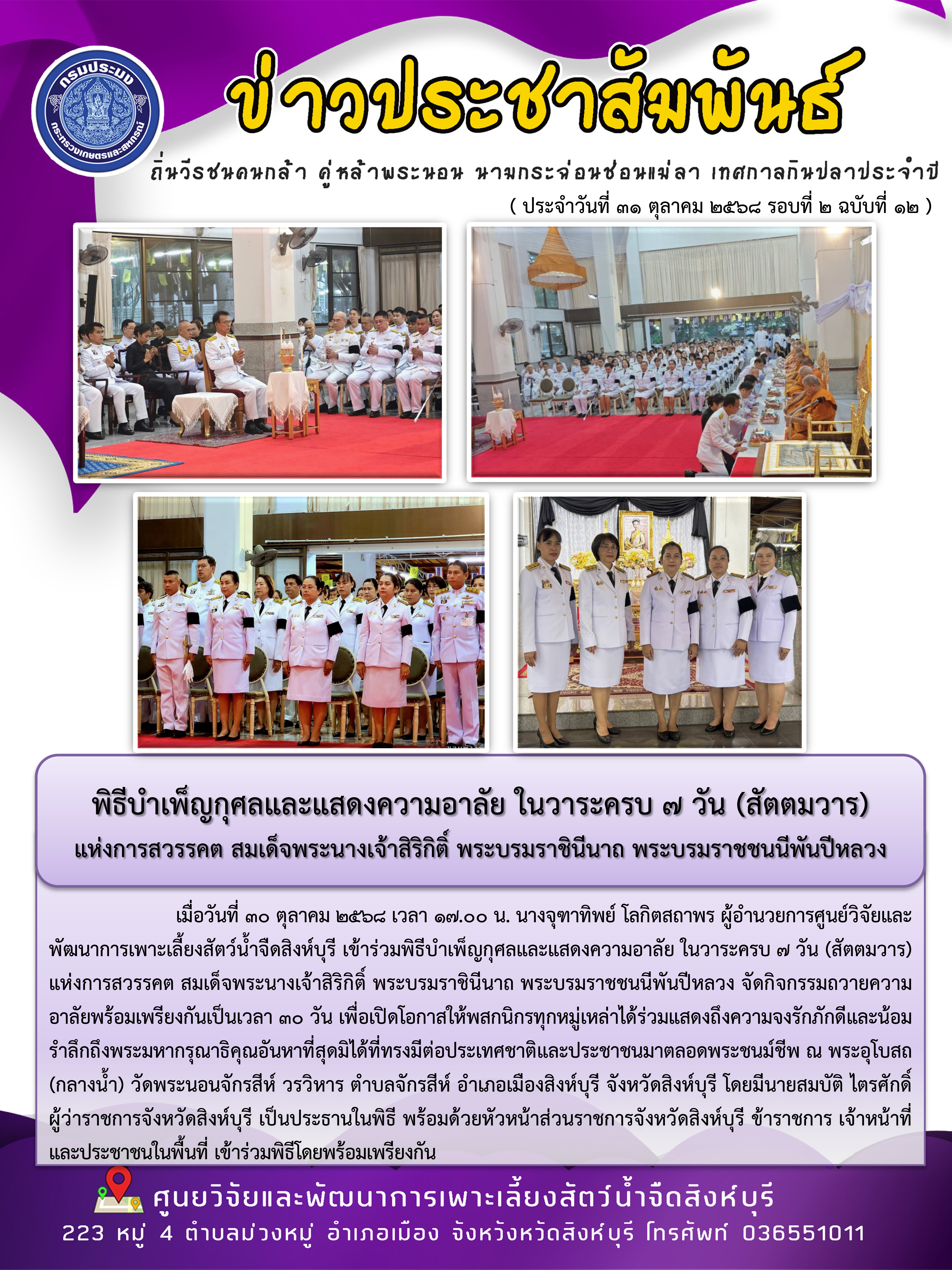 [2025-10-31] พิธีบำเพ็ญกุศลและแสดงความอาลัย ในวาระครบ 7 วัน (สัตตมวาร) แห่งการสวรร.. [2025-10-31] การประชุมปรึกษาหารือกำหนดจัดงาน เทศกาลกินปลาและของดีเมืองสิงห์ ครั้งที.. [2025-10-30] เข้าร่วมการประชุมคณะกรมการจังหวัดสิงห์บุรี ประจำเดือนตุลาคม พ.ศ. 2568.. [2025-10-29] เข้าร่วมชมนิทรรศการเฉลิมพระเกียรติพระบาทสมเด็จพระเจ้าอยู่หัว สมเด็จพร.. [2025-10-27] ร่วมพิธีสรงน้ำพระบรมศพ เบื้องหน้าพระฉายาลักษณ์สมเด็จพระนางเจ้าสิริกิติ.. [2025-10-27] ร่วมพิธีถวายผ้าพระกฐินพระราชทาน โครงการทอดกฐินสามัครคี เพื่อถวายเป็นพร.. [2025-10-27] ร่วมรับเสด็จ สมเด็จพระกนิษฐาธิราชเจ้า กรมสมเด็จพระเทพรัตนราชสุดาฯ สยาม.. [2025-10-24] สนับสนุนพันธุ์ปลากินพืช เพื่อปล่อยลงสู่แหล่งน้ำบึงพักทัน หมู่ที่ 2 ต.. [2025-10-24] กิจกรรมจิตอาสาเฉพาะกิจ (ภัยพิบัติ) ป้องกันน้ำท่วม เนื่องในวันคล้ายวัน.. [2025-10-24] พิธีวางพวงมาลา เนื่องในวันคล้ายวันสวรรคต พระบาทสมเด็จพระจุลจอมเกล้าเจ.. อ่านทั้งหมด