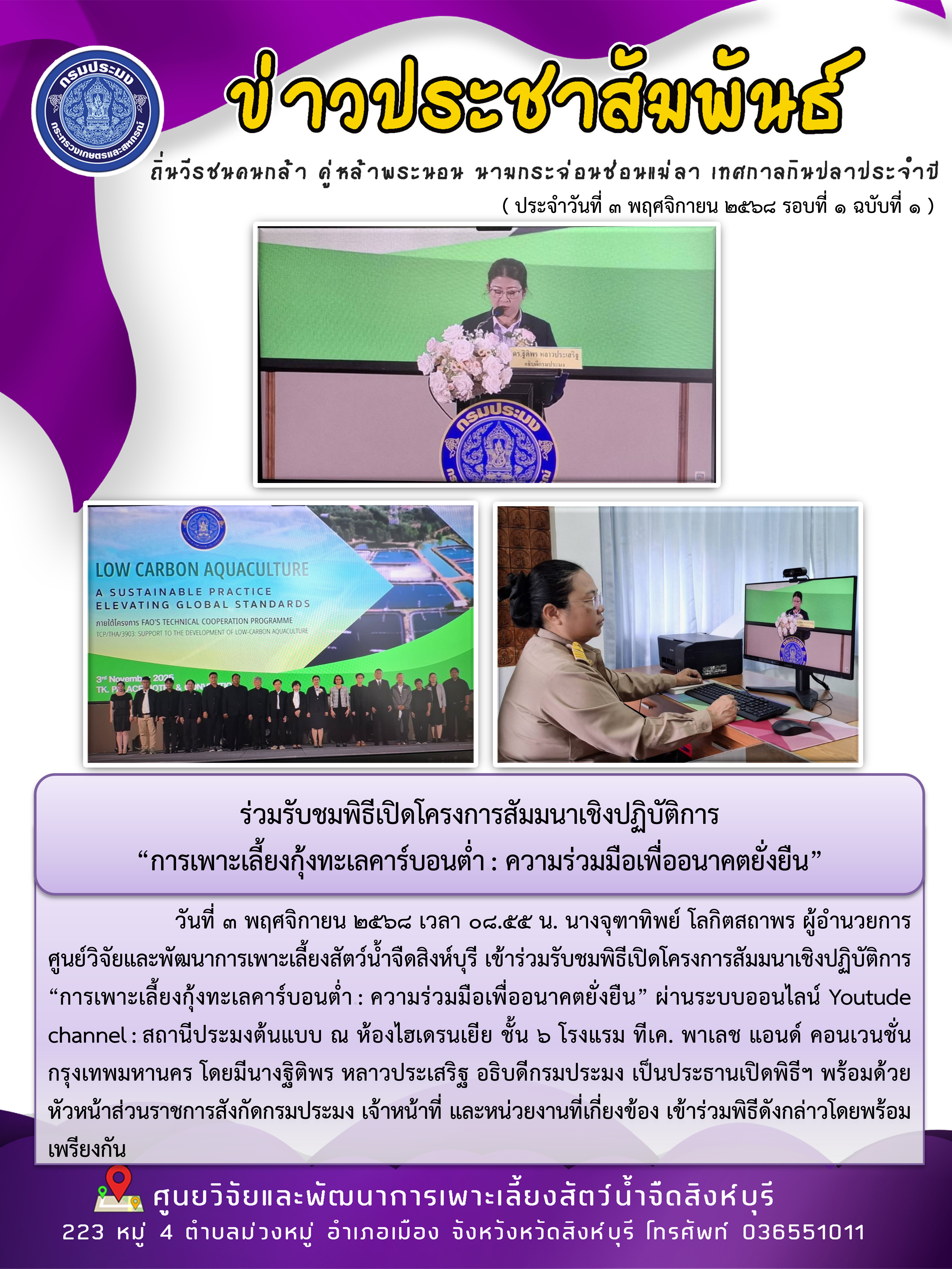 ร่วมรับชมพิธีเปิดโครงการสัมมนาเชิงปฏิบัติการ “การเพาะเลี้ยงกุ้งทะเลคาร์บอนต่ำ.: ความร่วมมือเพื่ออนาคตยั่งยืน”