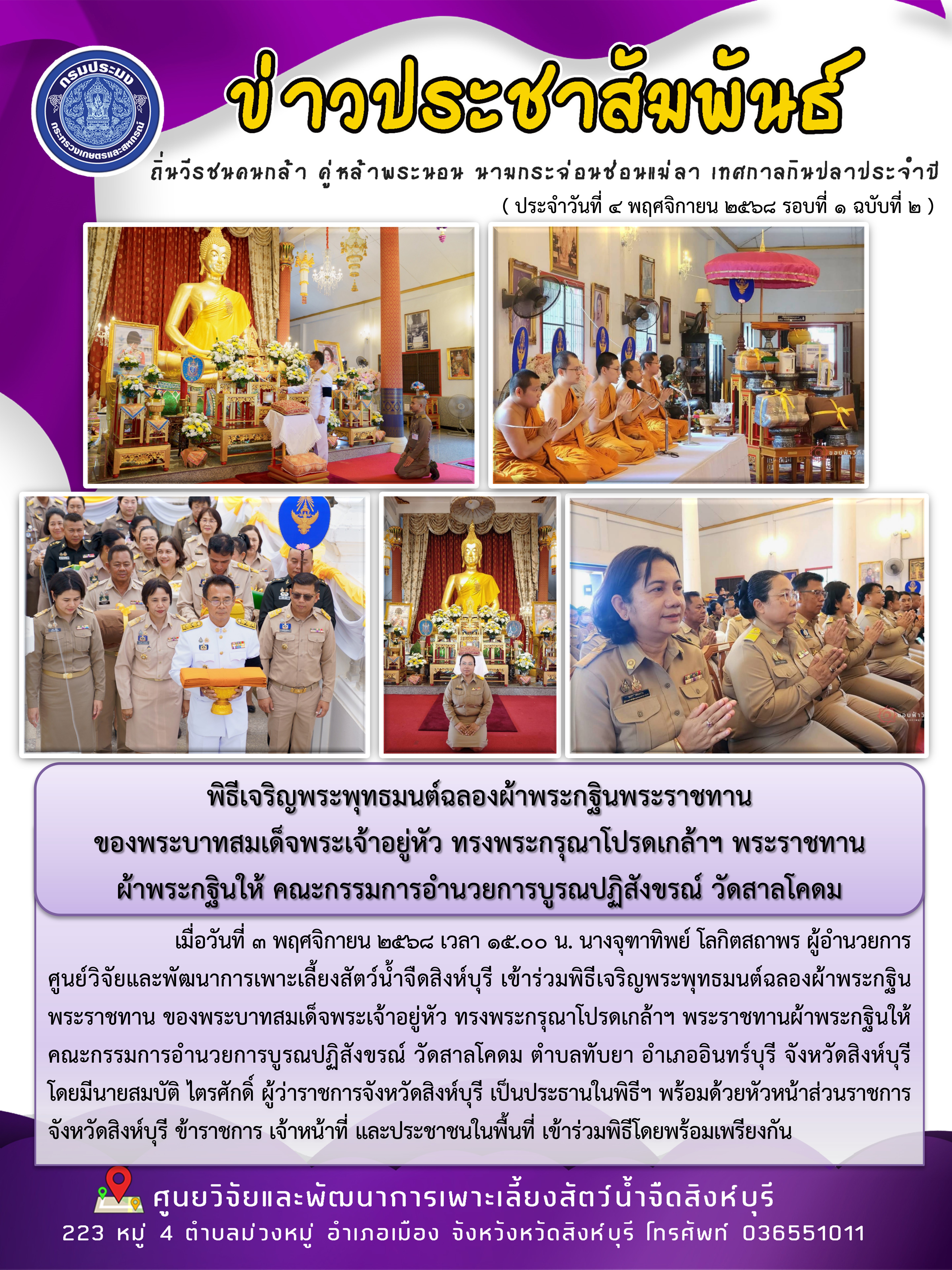 [2025-11-04] พิธีเจริญพระพุทธมนต์ฉลองผ้าพระกฐินพระราชทาน ของพระบาทสมเด็จพระเจ้าอยู.. [2025-11-03] ร่วมรับชมพิธีเปิดโครงการสัมมนาเชิงปฏิบัติการ “การเพาะเลี้ยงกุ้งทะเลคา.. [2025-10-31] พิธีบำเพ็ญกุศลและแสดงความอาลัย ในวาระครบ 7 วัน (สัตตมวาร) แห่งการสวรร.. [2025-10-31] การประชุมปรึกษาหารือกำหนดจัดงาน เทศกาลกินปลาและของดีเมืองสิงห์ ครั้งที.. [2025-10-30] เข้าร่วมการประชุมคณะกรมการจังหวัดสิงห์บุรี ประจำเดือนตุลาคม พ.ศ. 2568.. [2025-10-29] เข้าร่วมชมนิทรรศการเฉลิมพระเกียรติพระบาทสมเด็จพระเจ้าอยู่หัว สมเด็จพร.. [2025-10-27] ร่วมพิธีสรงน้ำพระบรมศพ เบื้องหน้าพระฉายาลักษณ์สมเด็จพระนางเจ้าสิริกิติ.. [2025-10-27] ร่วมพิธีถวายผ้าพระกฐินพระราชทาน โครงการทอดกฐินสามัครคี เพื่อถวายเป็นพร.. [2025-10-27] ร่วมรับเสด็จ สมเด็จพระกนิษฐาธิราชเจ้า กรมสมเด็จพระเทพรัตนราชสุดาฯ สยาม.. [2025-10-24] สนับสนุนพันธุ์ปลากินพืช เพื่อปล่อยลงสู่แหล่งน้ำบึงพักทัน หมู่ที่ 2 ต.. อ่านทั้งหมด