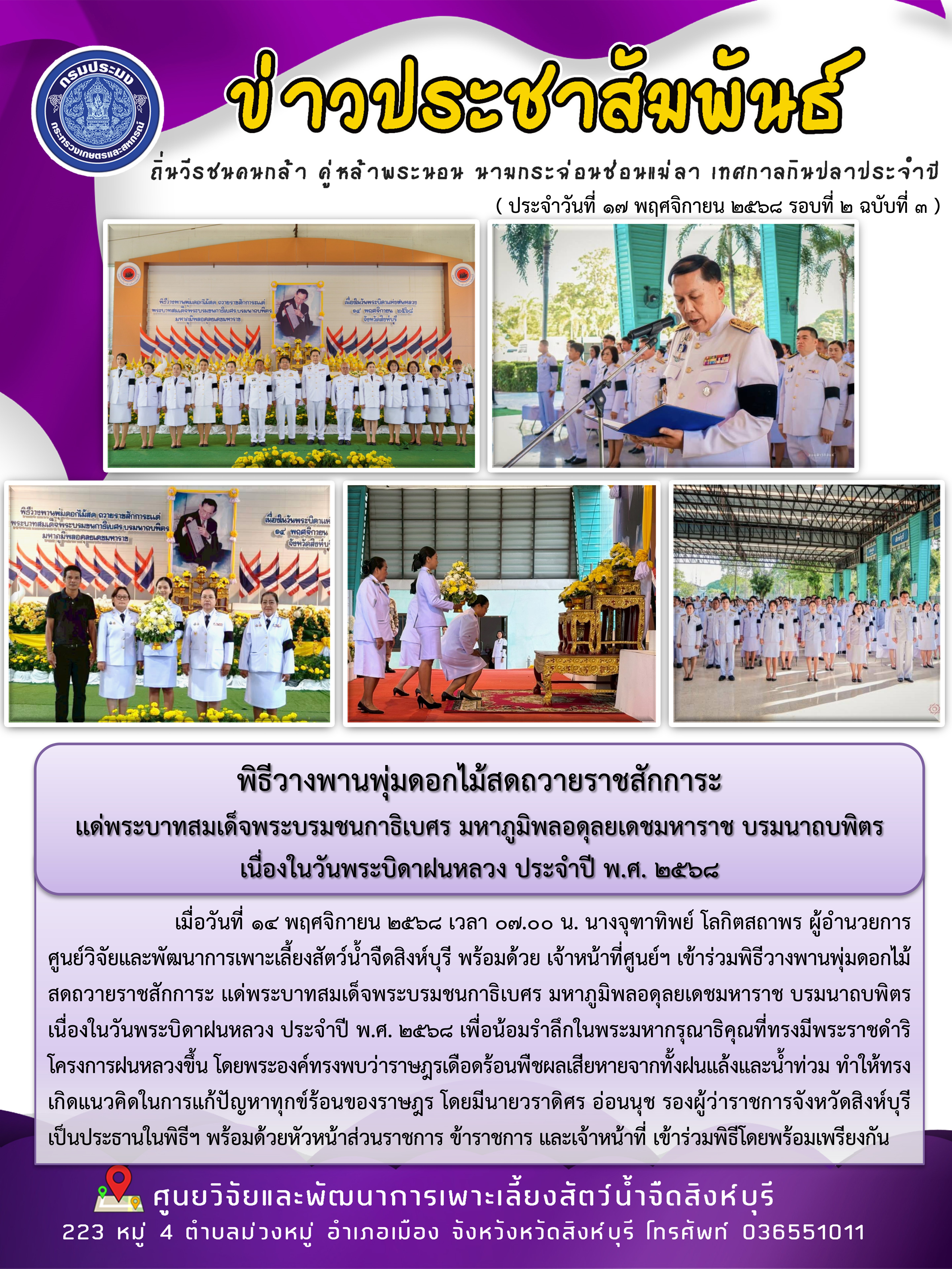 พิธีวางพานพุ่มดอกไม้สดถวายราชสักการะ เเด่พระบาทสมเด็จพระบรมชนกาธิเบศร มหาภูมิพลอดุลยเดชมหาราช บรมนาถบพิตร เนื่องในวันพระบิดาฝนหลวง ประจำปี พ.ศ. 2568