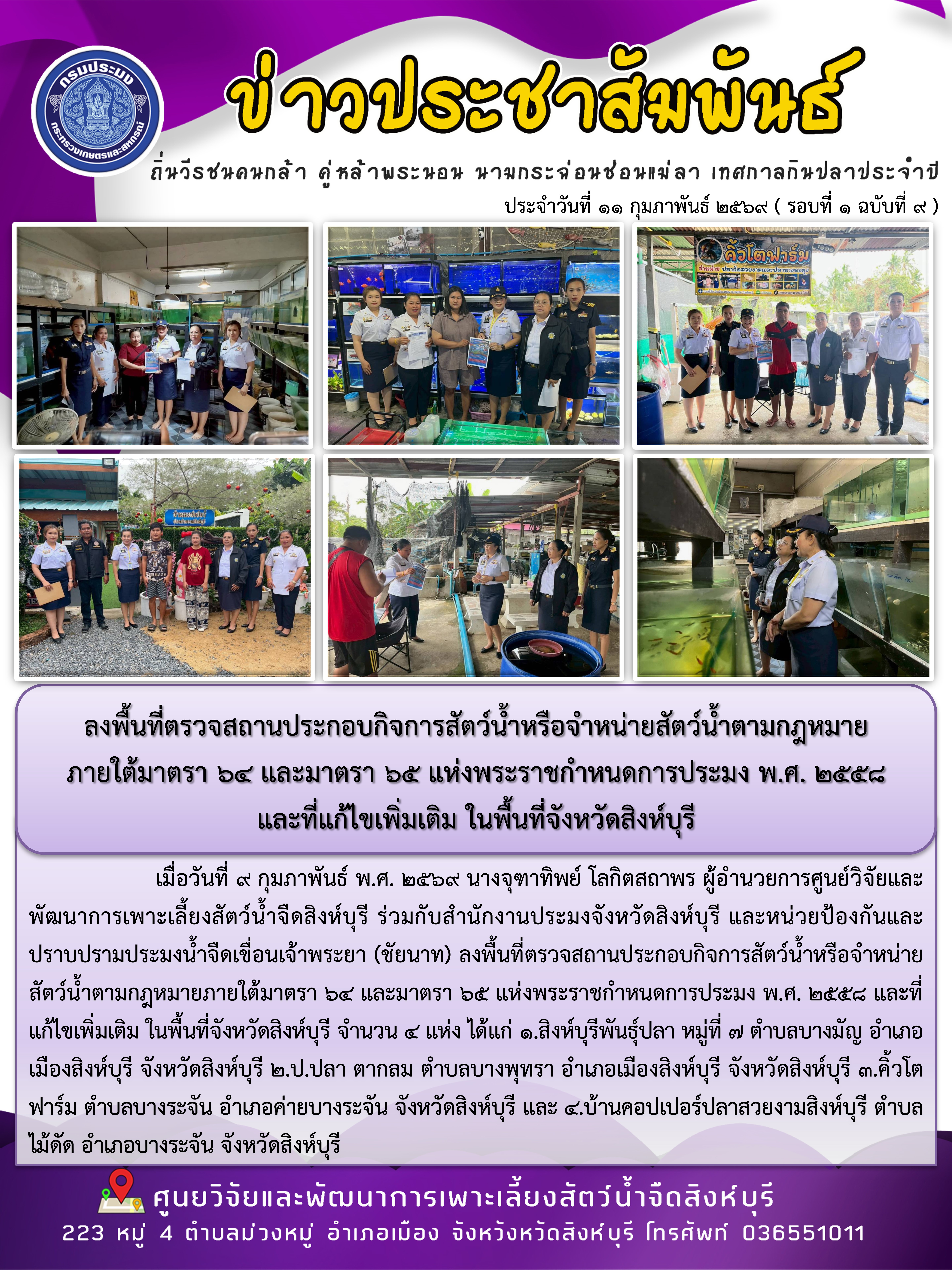 ลงพื้นที่ตรวจสถานประกอบกิจการสัตว์น้ำหรือจำหน่ายสัตว์น้ำตามกฎหมาย ภายใต้มาตรา 64 และมาตรา 65 แห่งพระราชกำหนดการประมง พ.ศ. 2558 และที่แก้ไขเพิ่มเติม ในพื้นที่จังหวัดสิงห์บุรี