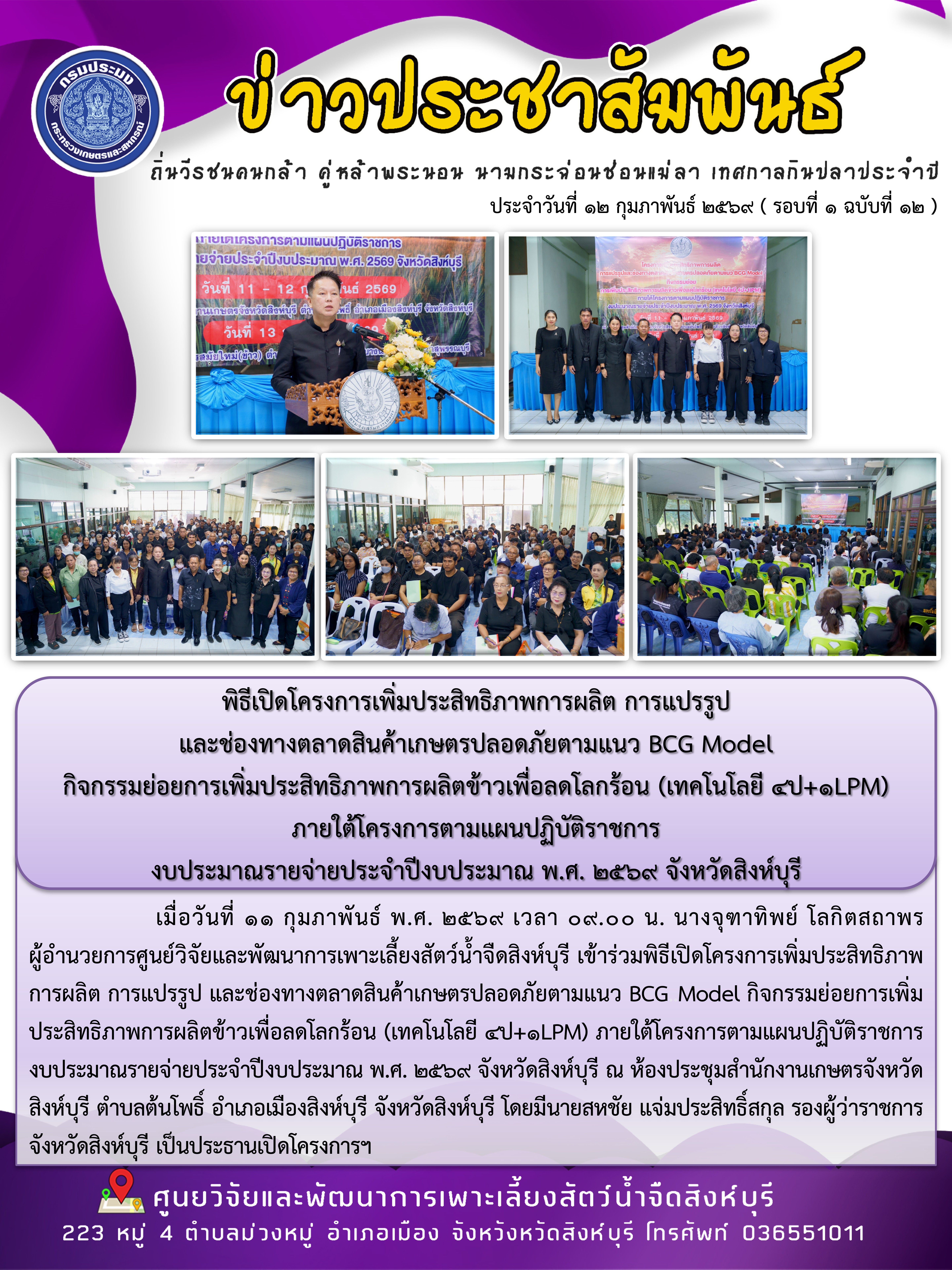 พิธีเปิดโครงการเพิ่มประสิทธิภาพการผลิต การแปรรูป และช่องทางตลาดสินค้าเกษตรปลอดภัยตามแนว BCG Model กิจกรรมย่อยการเพิ่มประสิทธิภาพการผลิตข้าวเพื่อลดโลกร้อน (เทคโนโลยี 4ป+1LPM) ภายใต้โครงการตามแผนปฏิบัติราชการ งบประมาณรายจ่ายประจำปีงบประมาณ พ.ศ. 2569 จังหวัดสิงห์บุรี