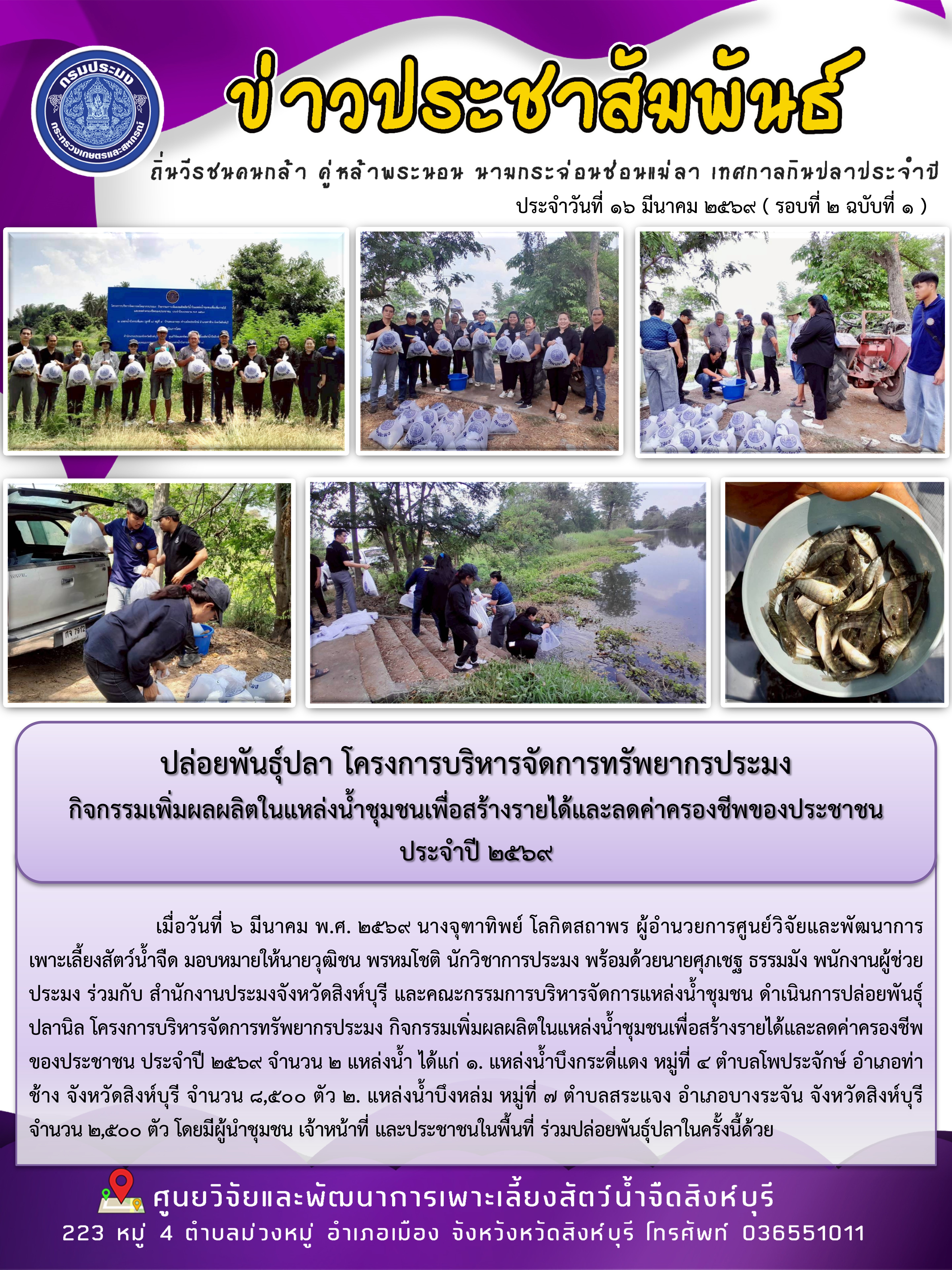 ปล่อยพันธุ์ปลา โครงการบริหารจัดการทรัพยากรประมง กิจกรรมเพิ่มผลผลิตในแหล่งน้ำชุมชนเพื่อสร้างรายได้และลดค่าครองชีพของประชาชน ประจำปี 2569
