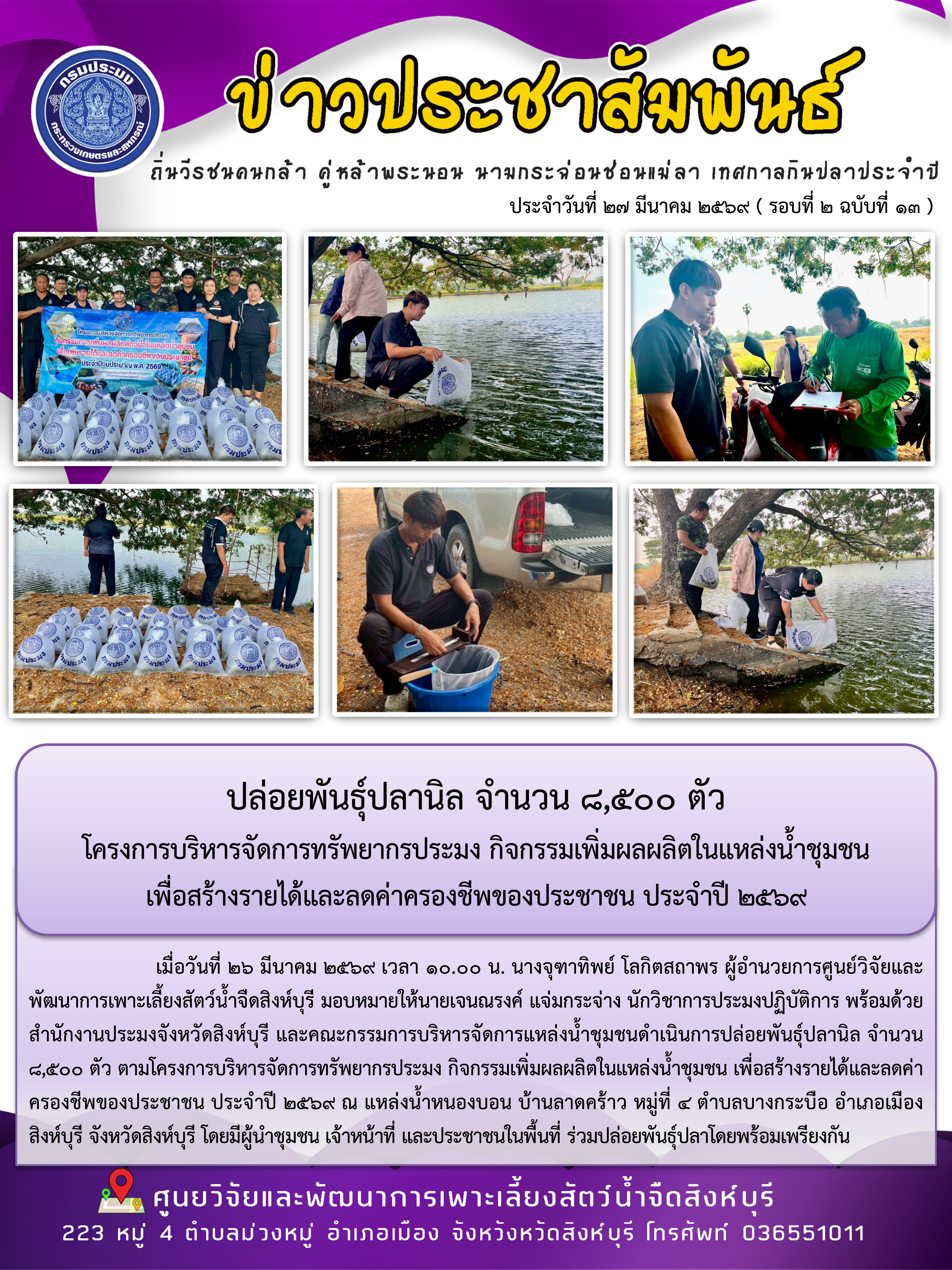 ปล่อยพันธุ์ปลานิล จำนวน 8,500 ตัว โครงการบริหารจัดการทรัพยากรประมง กิจกรรมเพิ่มผลผลิตในแหล่งน้ำชุมชน เพื่อสร้างรายได้และลดค่าครองชีพของประชาชน ประจำปี 2569