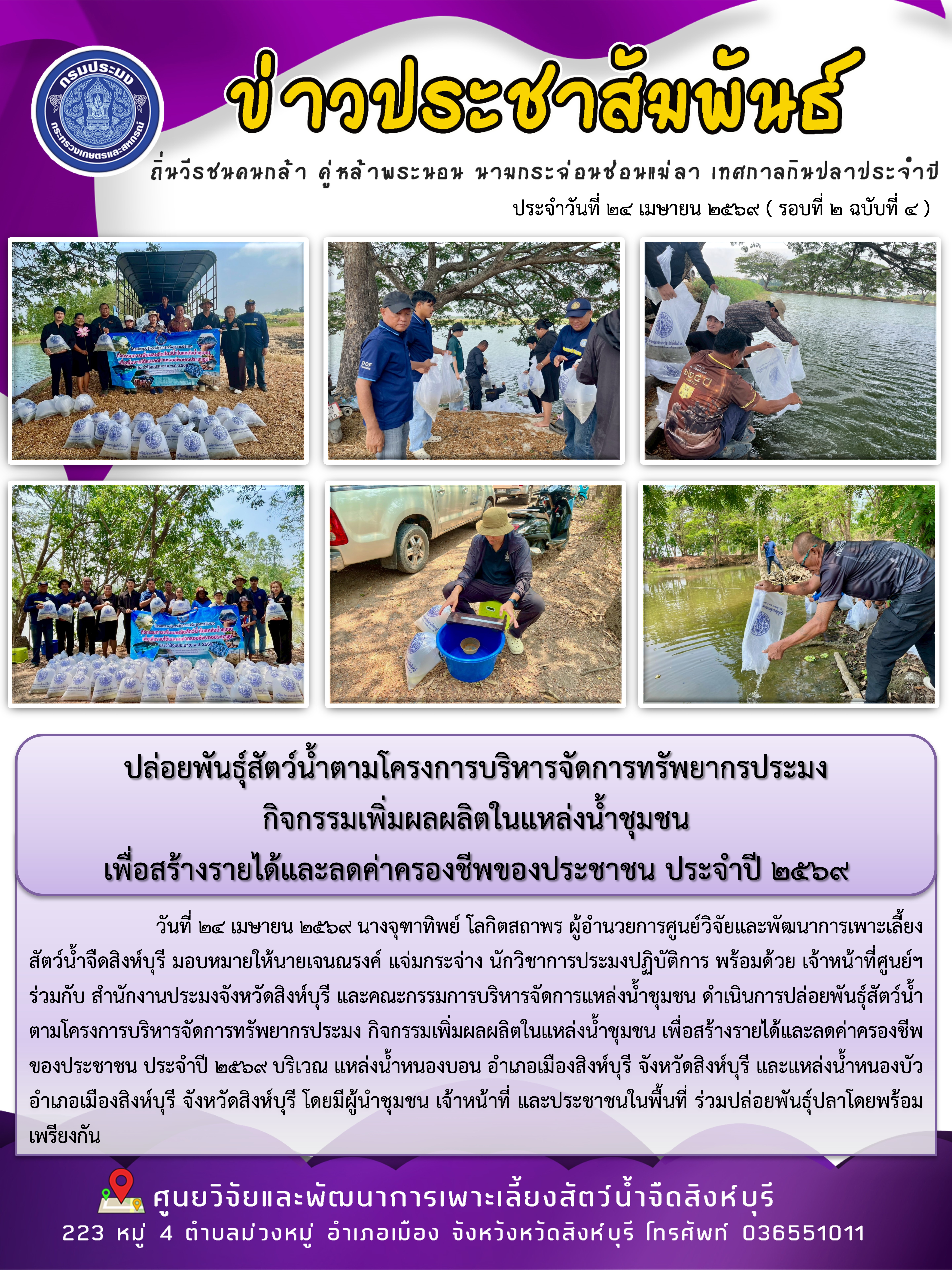 ปล่อยพันธุ์สัตว์น้ำตามโครงการบริหารจัดการทรัพยากรประมง กิจกรรมเพิ่มผลผลิตในแหล่งน้ำชุมชน เพื่อสร้างรายได้และลดค่าครองชีพของประชาชน ประจำปี 2569