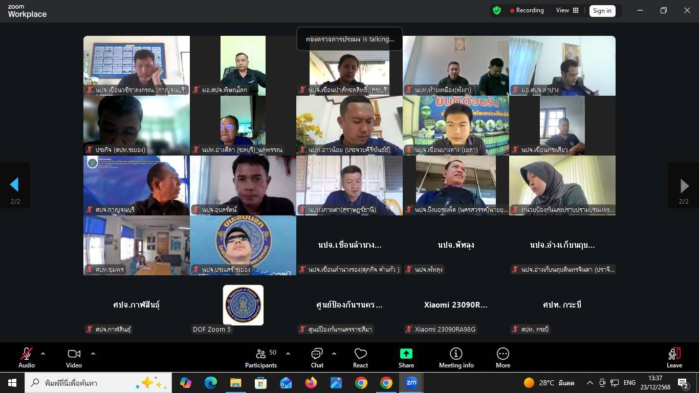 วันที่ 23 ธ.ค. 68 นปท.บางสะพานฯ ศปท.ชุมพร กองตรวจการประมง กรมประมง โดย นายสมชาย ศรีสวัสดิ์ หัวหน้าหน่วยฯ พร้อมเจ้าหน้าที่ เข้าร่วมประชุมผ่านทางระบบออนไลน์ (zoom) ในเรื่องการเตรียมความพร้อม และวางแนวทางการดำเนินการสัมมนา ให้บรรลุวัตถุประสงค์ โดยมีนายสิทธิพล เมืองสง ผู้อำนวยการกองตรวจการประมง เป็นประธานในการประชุม