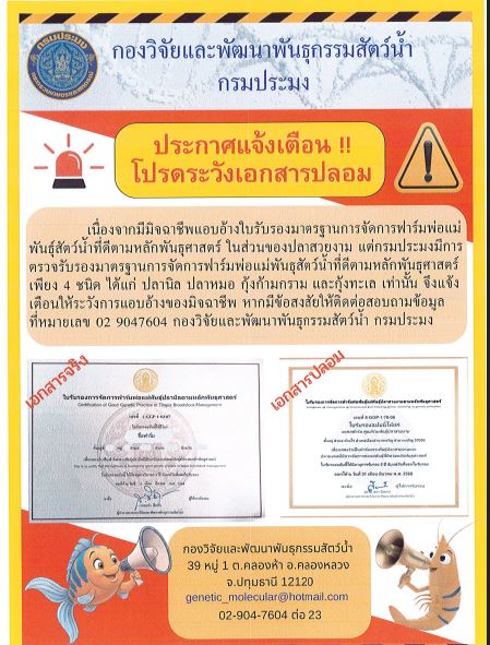 ประชาสัมพันธ์ แจ้งเตือนการแอบอ้างใบรับรองมาตรฐานการจัดการฟาร์มพ่อแม่พันธุ์สัตว์น้ำที่ดีตามหลักพันธุศาสตร์