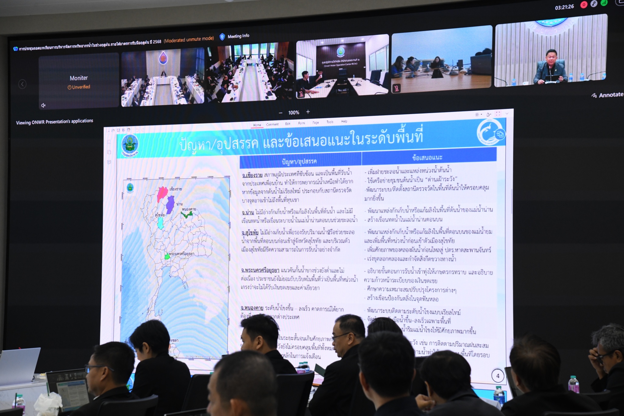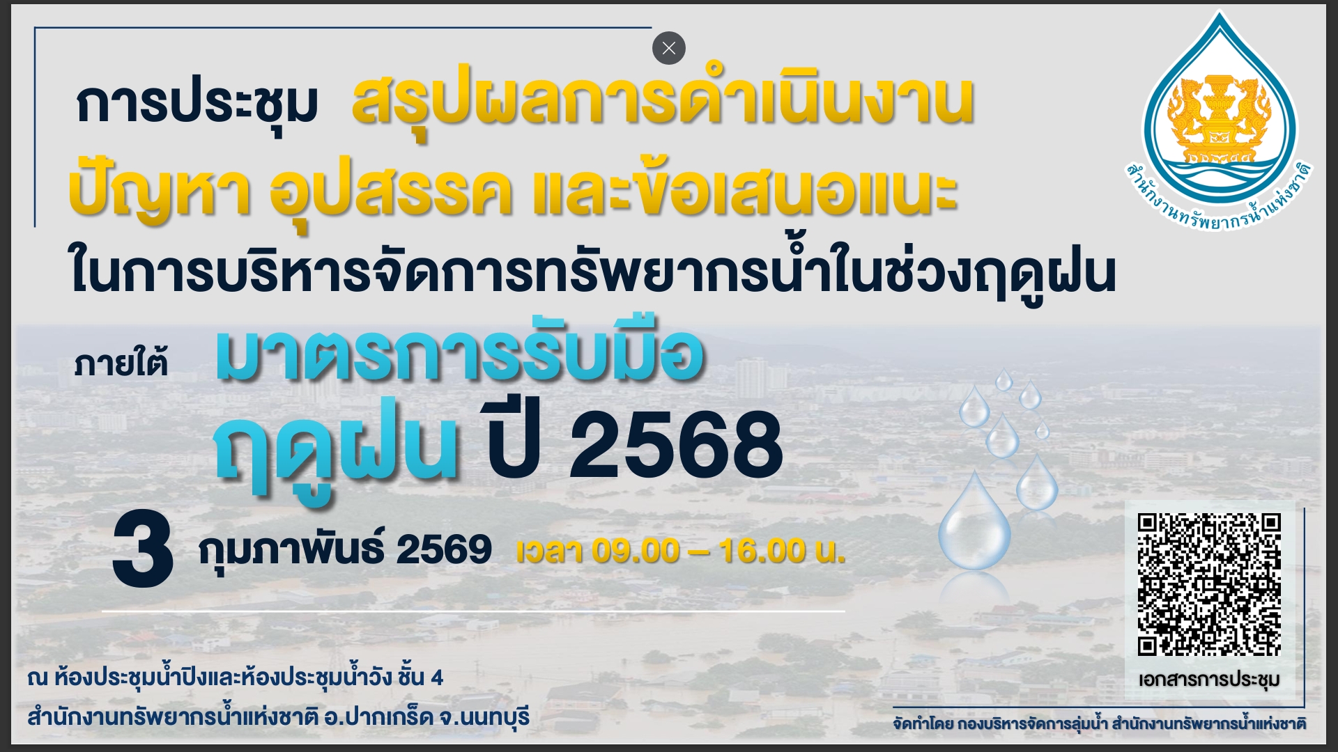 วันอังคารที่ 3 กุมภาพันธ์ 2569 เวลา 09.00 - 16.00 น. นายชยันต์ เมืองสง เลขาธิการสำนักงานทรัพยากรน้ำแห่งชาติ (สทนช.) เป็นประธานการประชุมสรุปผลการดำเนินงานปัญหา อุปสรรค และข้อเสนอแนะ ในการบริหารจัดการทรัพยากรน้ำในช่วงฤดูฝน ภายใต้มาตรการรับมือฤดูฝน ปี 2568 โดยมี นายไพฑูรย์ เก่งการช่าง รองเลขาธิการ สทนช. นายเผด็จ ลายทอง รองปลัดกระทรวงทรัพยากรธรรมชาติและสิ่งแวดล้อม นายสุวภาคย์ อิ่มสมุทร รองอธิบดีกรมทรัพยากรธรณี นายเกิดศักดิ์ ยะโธธร รองอธิบดีกรมโยธาธิการและผังเมือง พร้อมด้วย ผู้แทนจากหน่วยงานที่เกี่ยวข้อง จำนวน 9 กระทรวง 35 หน่วยงาน อาทิ กรมอุตุนิยมวิทยา สถาบันสารสนเทศทรัพยากรน้ำ (องค์การมหาชน) กรมทรัพยากรธรณี กรมชลประทาน กรมประมง การไฟฟ้าฝ่ายผลิตแห่งประเทศไทย กรมทรัพยากรน้ำ กรมโยธาธิการและผังเมือง สำนักงานพัฒนาเทคโนโลยีอวกาศและภูมิสารสนเทศ (องค์การมหาชน) กรมฝนหลวงและการบินเกษตร กรมส่งเสริมการปกครองท้องถิ่น กรมส่งเสริมการเกษตร การประปาส่วนภูมิภาค กรมป้องกันและบรรเทาสาธารณภัย กรมประชาสัมพันธ์ เป็นต้น ณ ห้องประชุมน้ำปิงและห้องประชุมน้ำวัง ชั้น 4 สทนช. อ.ปากเกร็ด จ.นนทบุรี และผ่านสื่ออิเล็กทรอนิกส์
