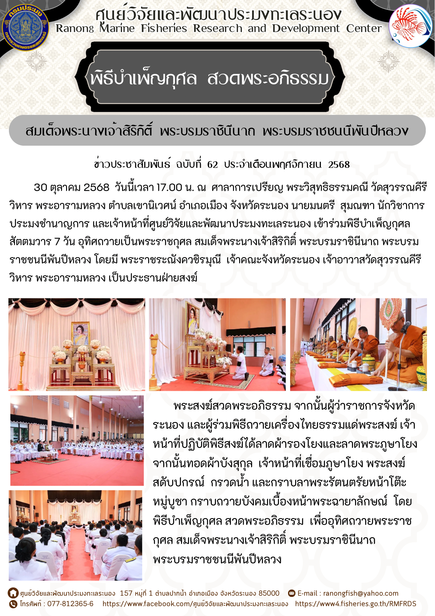 30 ตุลาคม 2568 วันนี้เวลา 17.00 น. ณ ศาลาการเปรียญ พระวิสุทธิธรรมคณี วัดสุวรรณคีรี วิหาร พระอารามหลวง ตำบลเขานิเวศน์ อำเภอเมือง จังหวัดระนอง นายมนตรี สุมณฑา นักวิชาการ ประมงชำนาญการ และเจ้าหน้าที่ศูนย์วิจัยและพัฒนาประมงทะเลระนอง เข้าร่วมพิธีบำเพ็ญกุศล สัตตมวาร 7 วัน อุทิศถวายเป็นพระราชกุศล สมเด็จพระนางเจ้าสิริกิติ์ พระบรมราชินีนาถ พระบรม ราชชนนีพันปีหลวง โดยมี พระราชระณังควชิรมุณี เจ้าคณะจังหวัดระนอง เจ้าอาวาสวัดสุวรรณคีรี วิหาร พระอารามหลวง เป็นประธานฝ่ายสงฆ์