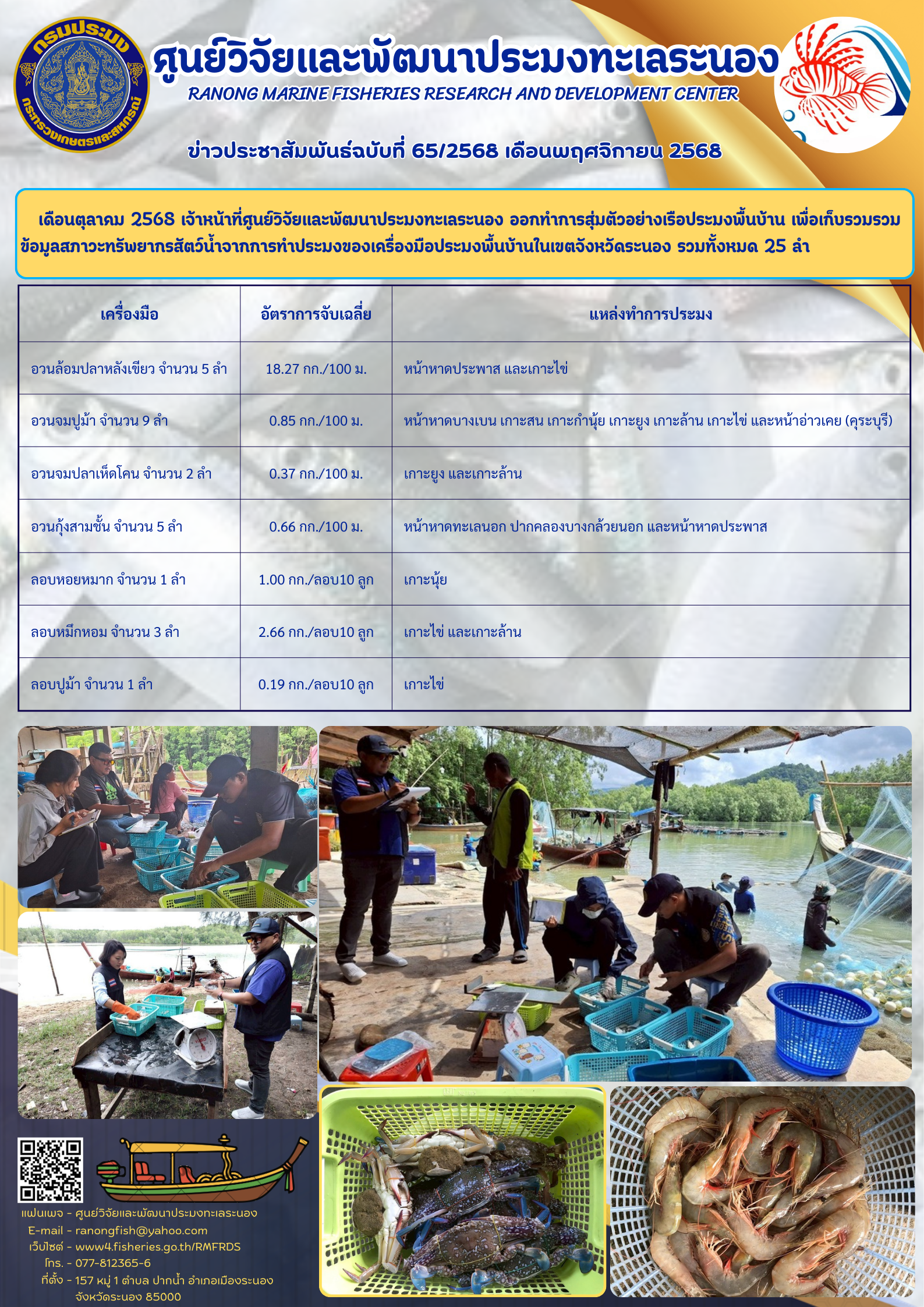 เดือนตุลาคม 2568 เจ้าหน้าที่ศูนย์วิจัยและพัฒนาประมงทะเลระนอง ออกทำการสุ่มตัวอย่างเรือประมงพื้นบ้าน เพื่อเก็บรวมรวมข้อมูลสภาวะทรัพยากรสัตว์น้ำจากการทำประมงของเครื่องมือประมงพื้นบ้านในเขตจังหวัดระนอง รวมทั้งหมด 25 ลำ