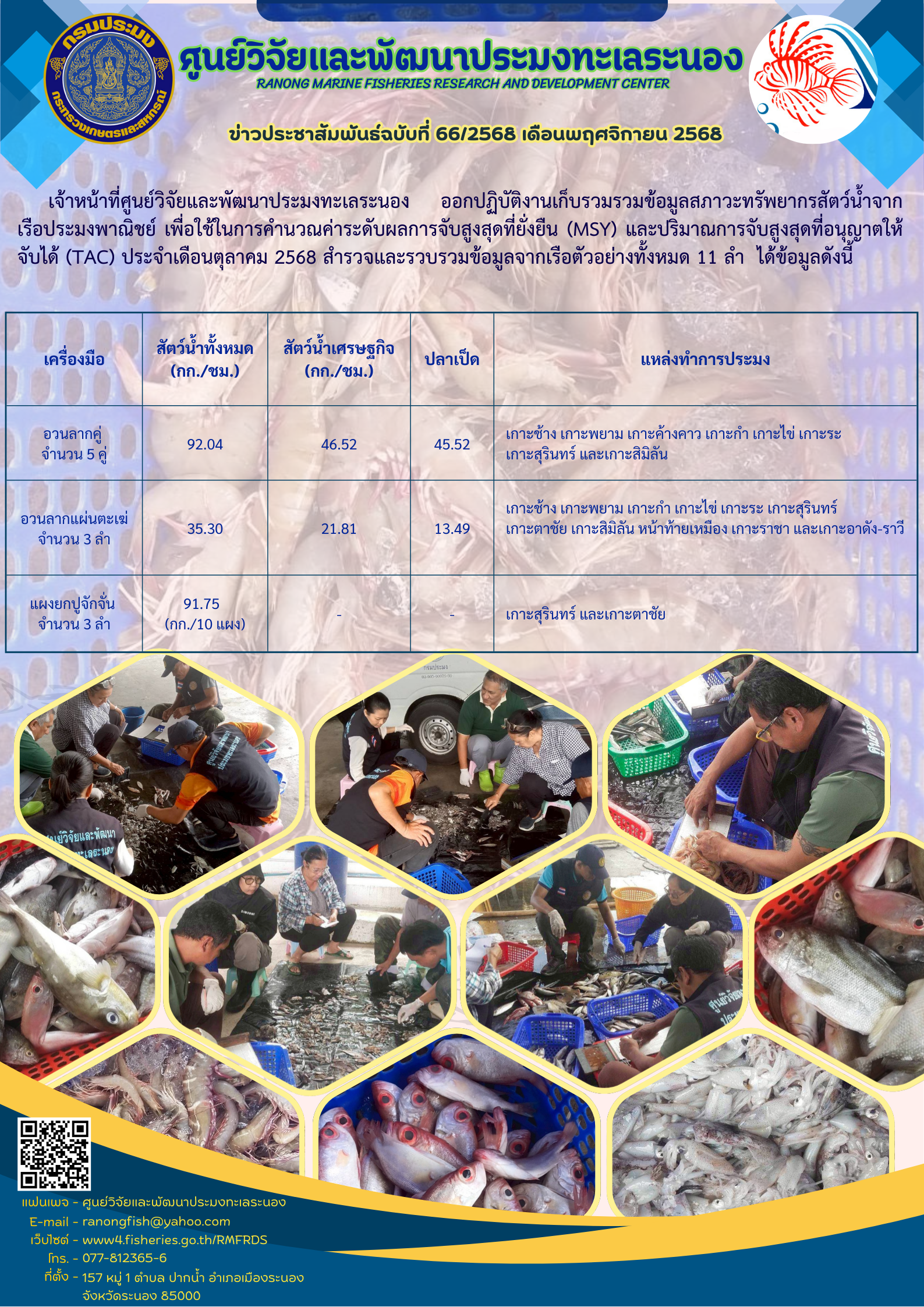 เจ้าหน้าที่ศูนย์วิจัยและพัฒนาประมงทะเลระนอง ออกปฏิบัติงานเก็บรวมรวมข้อมูลสภาวะทรัพยากรสัตว์น้ำจาก เรือประมงพาณิชย์ เพื่อใช้ในการคำนวณค่าระดับผลการจับสูงสุดที่ยั่งยืน (MSY) และปริมาณการจับสูงสุดที่อนุญาตให้จับได้ (TAC) ประจำเดือนตุลาคม 2568 สำรวจและรวบรวมข้อมูลจากเรือตัวอย่างทั้งหมด 11 ลำ ได้ข้อมูลดังนี้