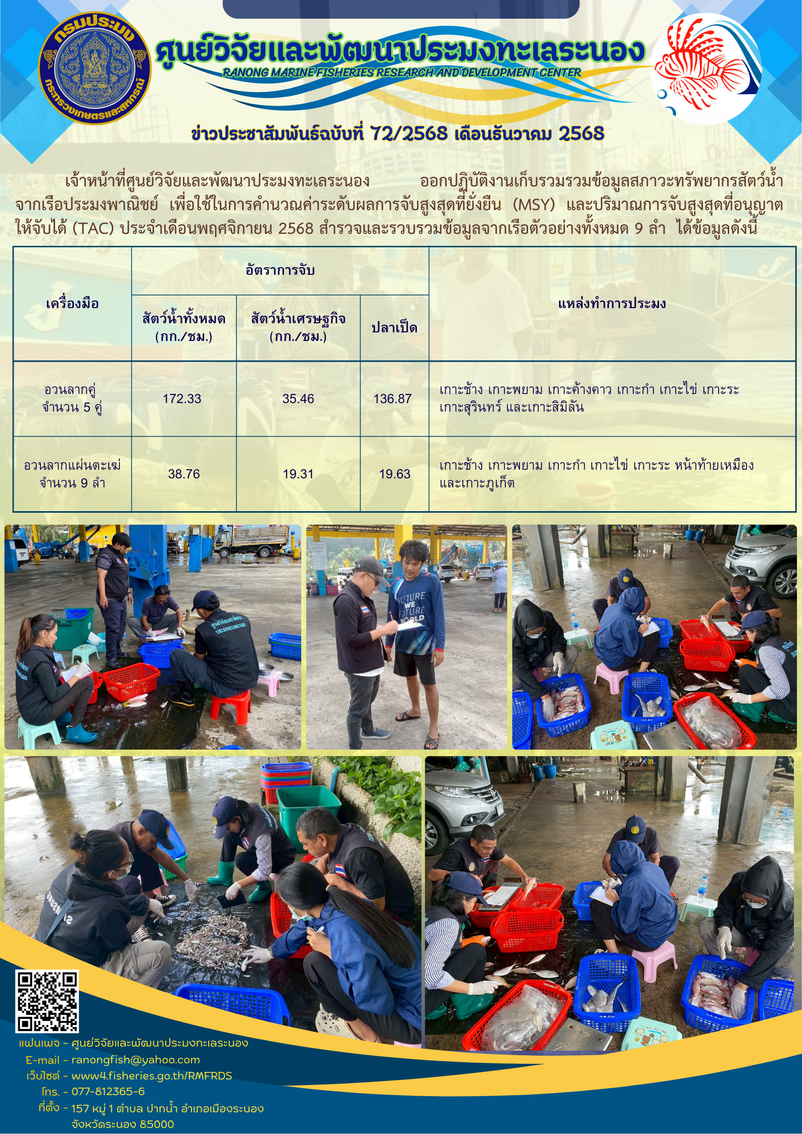 เจ้าหน้าที่ศูนย์วิจัยและพัฒนาประมงทะเลระนอง ออกปฏิบัติงานเก็บรวมรวมข้อมูลสภาวะทรัพยากรสัตว์น้ำ จากเรือประมงพาณิชย์ เพื่อใช้ในการคำนวณค่าระดับผลการจับสูงสุดที่ยั่งยืน (MSY) และปริมาณการจับสูงสุดที่อนุญาตให้จับได้ (TAC) ประจำเดือนพฤศจิกายน 2568 สำรวจและรวบรวมข้อมูลจากเรือตัวอย่างทั้งหมด 9 ลำ ได้ข้อมูลดังนี้