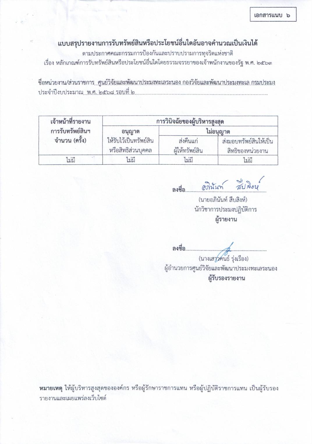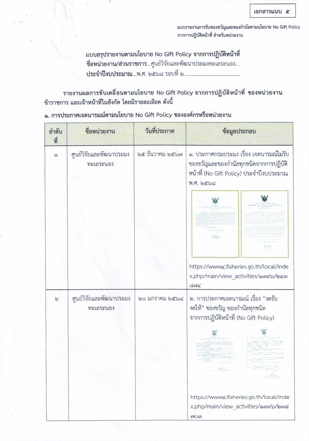 แบบสรุปรายงานตามนโยบาย No Gift Policy จากการปฏิบัติหน้าที่ ชื่อหน่วยงาน/ส่วนราชการ ศูนย์วิจัยและพัฒนาประมงทะเลระนอง ประจำปีงบประมาณ พ.ศ. ๒๕๖๘ รอบที่ 2
