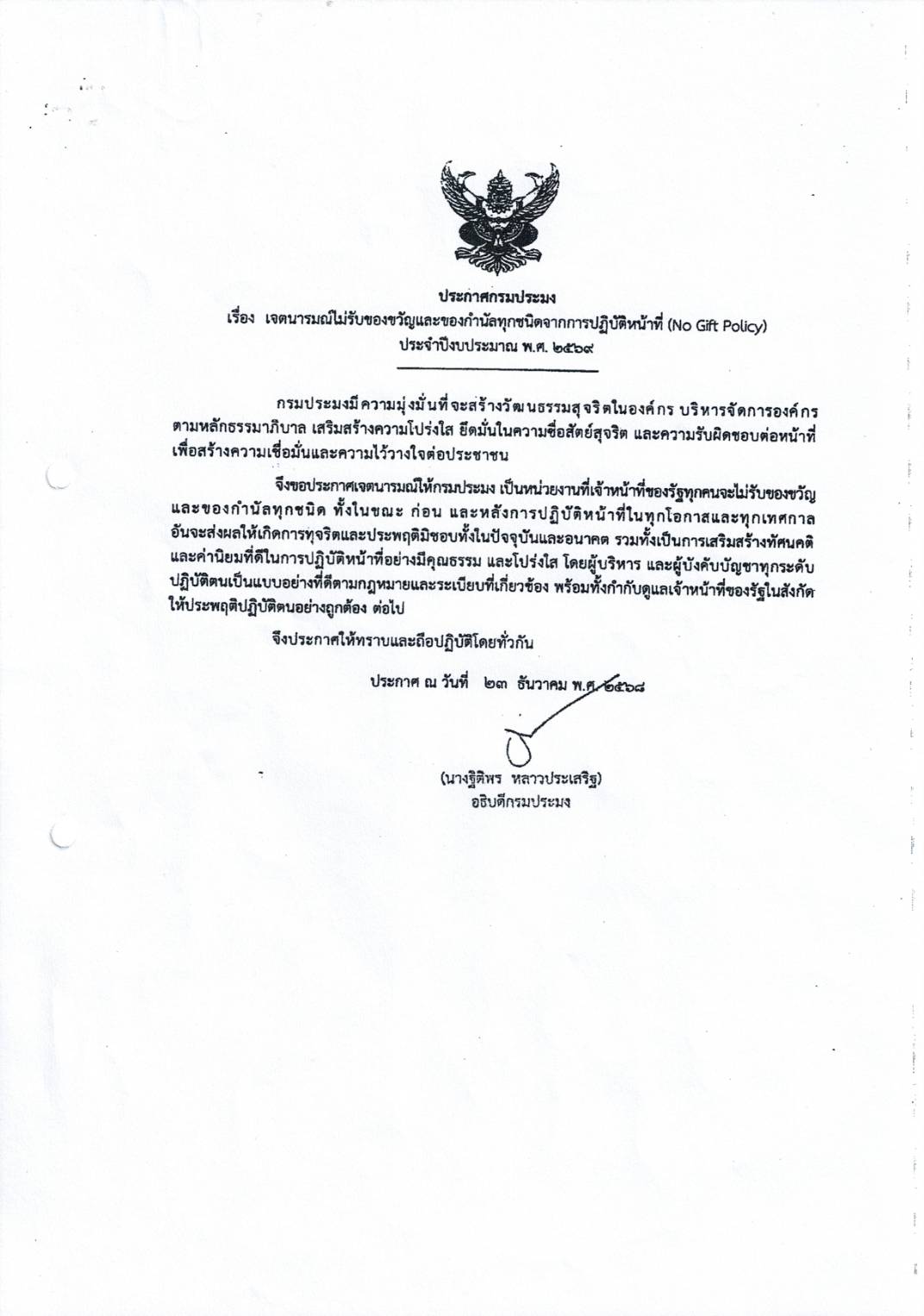 ประกาศกรมประมง เรื่อง เจตนารมณ์ไม่รับของขวัญและของกำนัลทุกชนิดจากการปฏิบัติหน้าที่ (No Gift Policy) ประจำปีงบประมาณ พ.ศ. 2569