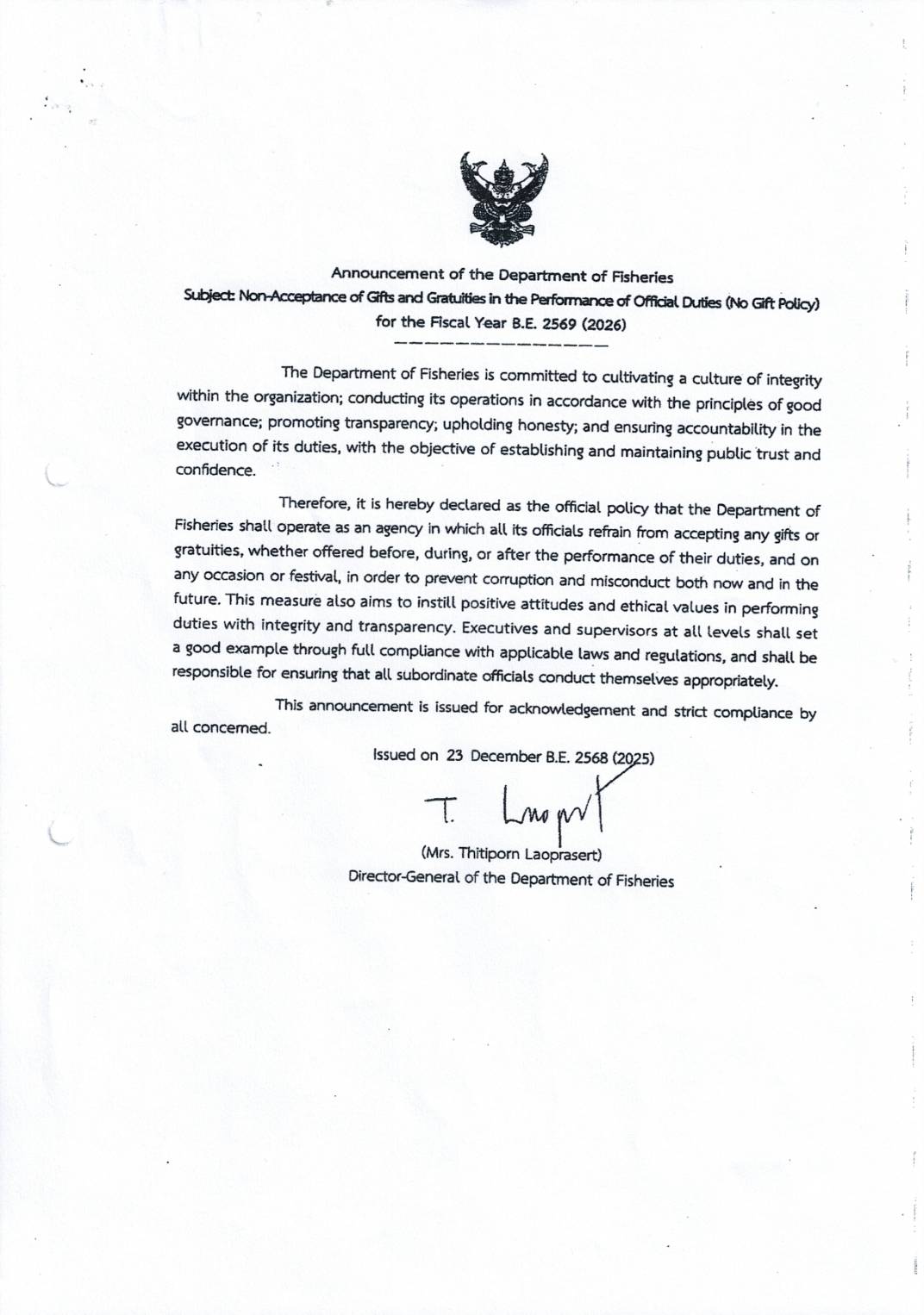 ประกาศกรมประมง เรื่อง เจตนารมณ์ไม่รับของขวัญและของกำนัลทุกชนิดจากการปฏิบัติหน้าที่ (No Gift Policy)