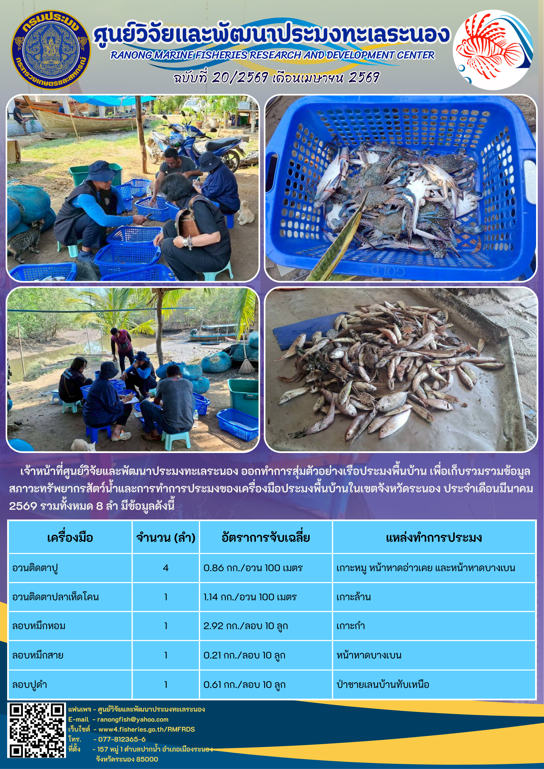 เจ้าหน้าที่ศูนย์วิจัยและพัฒนาประมงทะเลระนอง ออกทำการสุ่มตัวอย่างเรือประมงพื้นบ้าน เพื่อเก็บรวมรวมข้อมูลสภาวะทรัพยากรสัตว์น้ำและการทำการประมงของเครื่องมือประมงพื้นบ้านในเขตจังหวัดระนอง ประจำเดือนมีนาคม 2569 รวมทั้งหมด 8 ลำ มีข้อมูลดังนี้