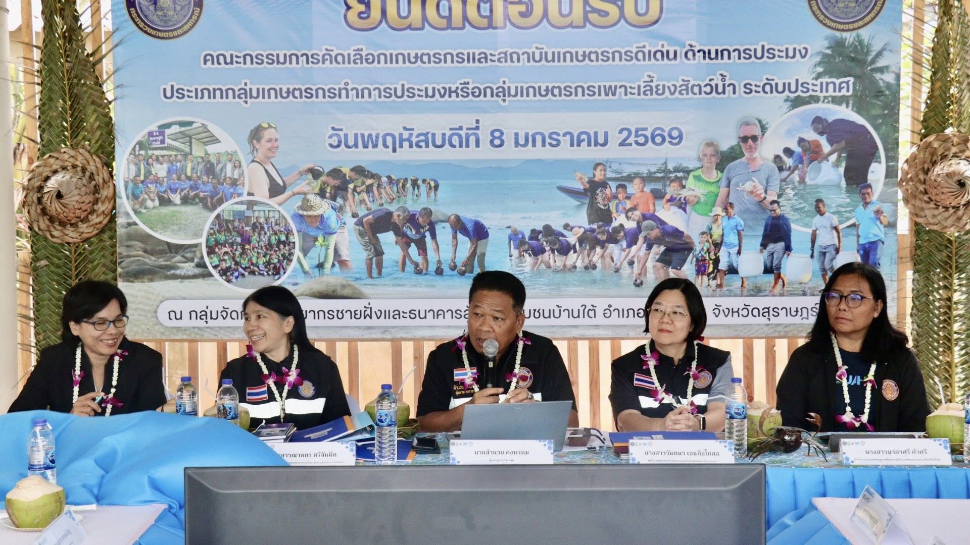 ต่อมาในวันพฤหัสบดีที่ 8 มกราคม 2569 คณะทำงานได้ลงพื้นที่ประเมินและคัดเลือกสถาบันเกษตรกรดีเด่น ณ กลุ่มอนุรักษ์ทรัพยากรชายฝั่งและธนาคารสัตว์น้ำชุมชนบ้านใต้ ตำบลแม่น้ำ อำเภอเกาะสมุย จังหวัดสุราษฎร์ธานี โดยมีนายณรงค์ เลี่ยนยงค์ หัวหน้ากลุ่มส่งเสริมและพัฒนาอาชีพการประมง สำนักงานประมงจังหวัดสุราษฎร์ธานี พร้อมเจ้าหน้าที่ในสังกัด ผู้นำท้องถิ่น และสมาชิกกลุ่ม ร่วมให้การต้อนรับและนำเสนอผลการดำเนินงาน