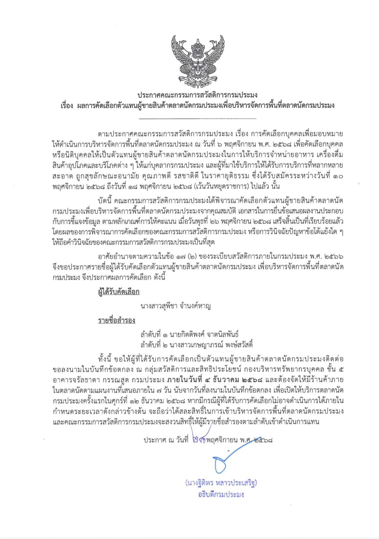 ประกาศคณะกรรมการสวัสดิการกรมประมง เรื่อง ผลการคัดเลือกตัวแทนผู้ขายสินค้าตลาดนัดกรมประมงเพื่อบริหารจัดการพื้นที่ตลาดนัดกรมประมง ประกาศ ณ วันที่ 28 พฤศจิกายน พ.ศ. 2568