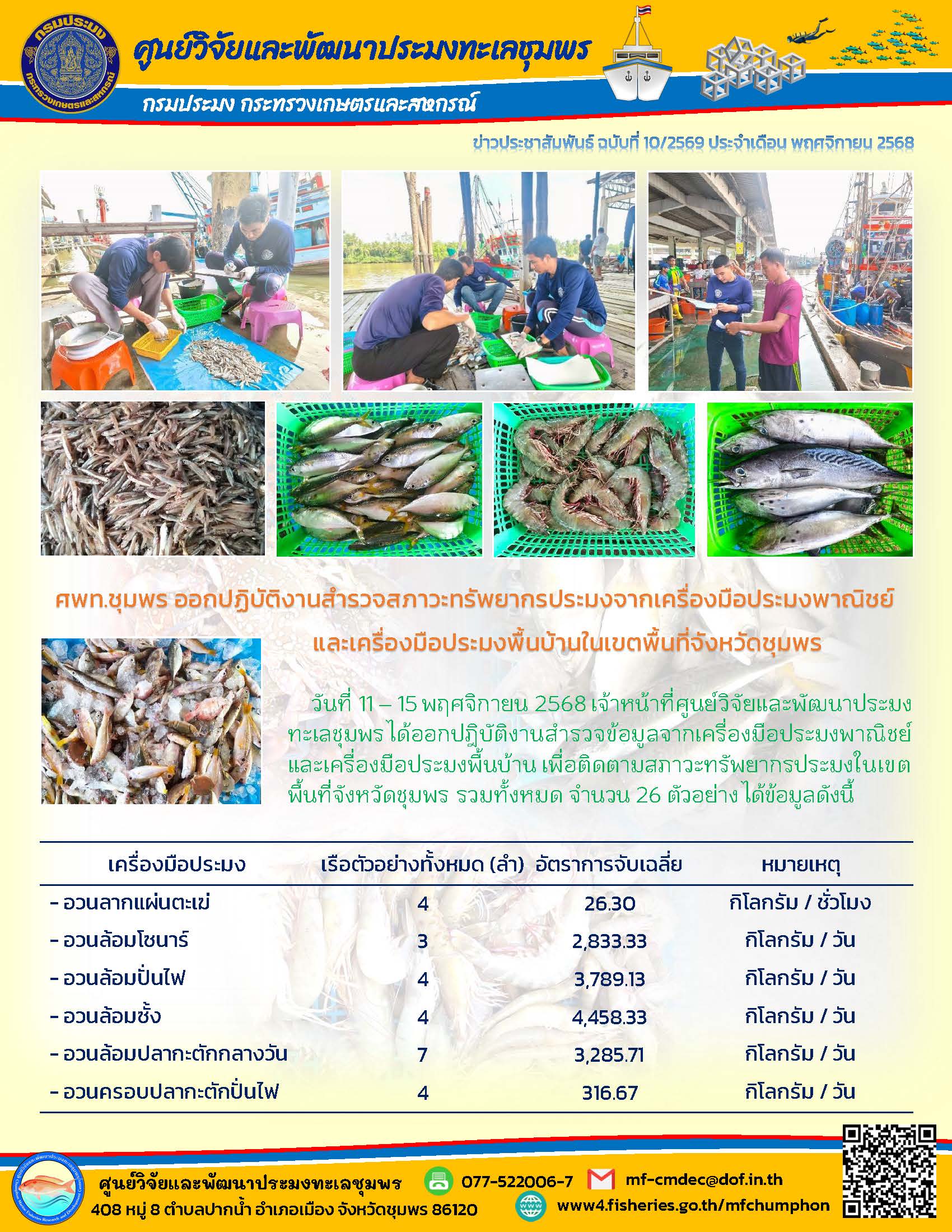 วันที่ 11 – 15 พฤศจิกายน 2568 เจ้าหน้าที่ศูนย์วิจัยและพัฒนาประมงทะเลชุมพร ได้ออกปฎิบัติงานสำรวจข้อมูลจากเครื่องมือประมงพาณิชย์และเครื่องมือประมงพื้นบ้าน เพื่อติดตามสภาวะทรัพยากรประมงในเขตพื้นที่จังหวัดชุมพร รวมทั้งหมด จำนวน 26 ตัวอย่าง