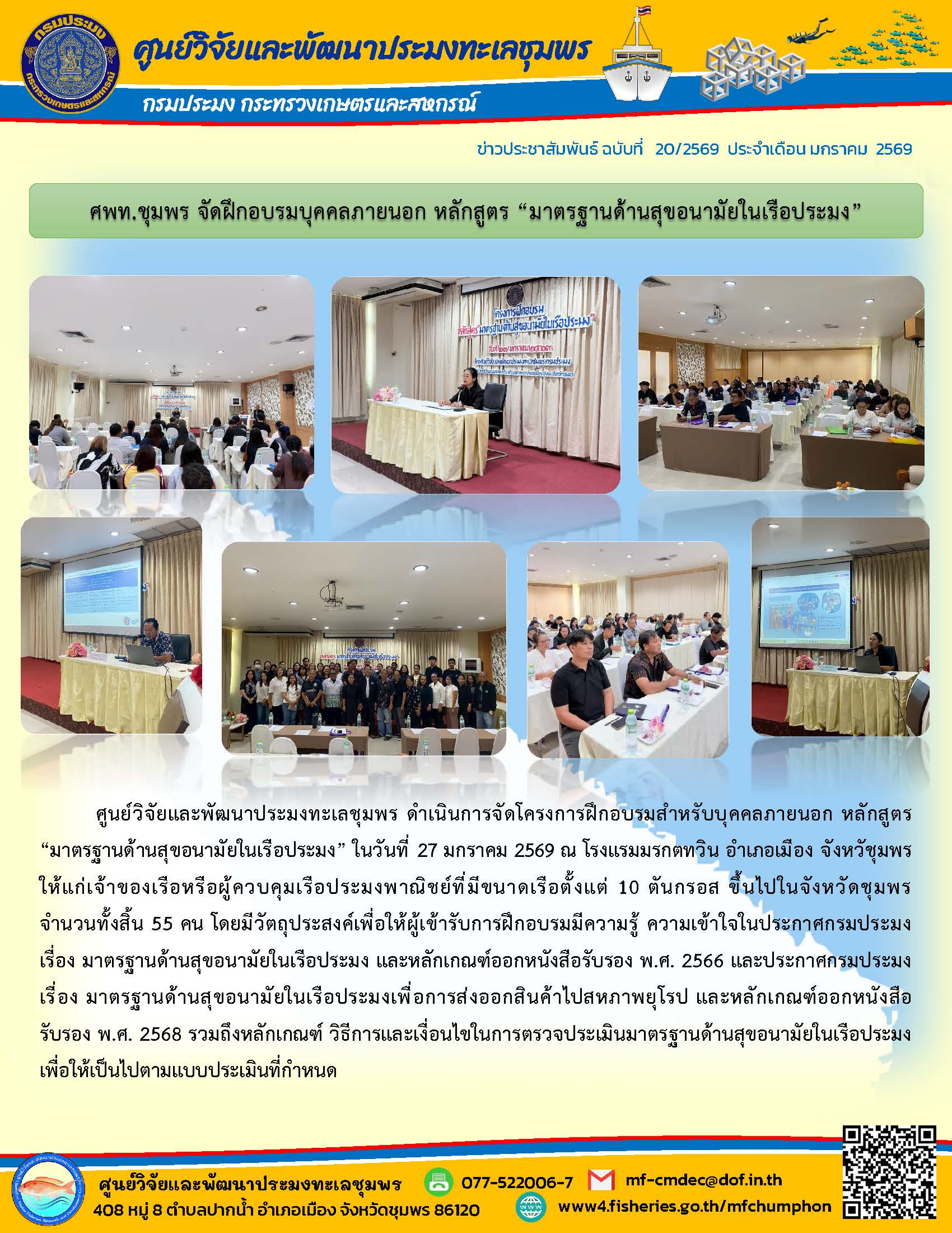 ศูนย์วิจัยและพัฒนาประมงทะเลชุมพร ดำเนินการจัดโครงการฝึกอบรมสำหรับบุคคลภายนอก หลักสูตร “มาตรฐานด้านสุขอนามัยในเรือประมง” ในวันที่ 27 มกราคม 2569 ณ โรงแรมมรกตทวิน อำเภอเมือง จังหวัชุมพร ให้แก่เจ้าของเรือหรือผู้ควบคุมเรือประมงพาณิชย์ที่มีขนาดเรือตั้งแต่ 10 ตันกรอส ขึ้นไปในจังหวัดชุมพร จำนวนทั้งสิ้น 55 คน โดยมีวัตถุประสงค์เพื่อให้ผู้เข้ารับการฝึกอบรมมีความรู้ ความเข้าใจในประกาศกรมประมง เรื่อง มาตรฐานด้านสุขอนามัยในเรือประมง และหลักเกณฑ์ออกหนังสือรับรอง พ.ศ. 2566 และประกาศกรมประมง เรื่อง มาตรฐานด้านสุขอนามัยในเรือประมงเพื่อการส่งออกสินค้าไปสหภาพยุโรป และหลักเกณฑ์ออกหนังสือรับรอง พ.ศ. 2568 รวมถึงหลักเกณฑ์ วิธีการและเงื่อนไขในการตรวจประเมินมาตรฐานด้านสุขอนามัยในเรือประมง เพื่อให้เป็นไปตามแบบประเมินที่กำหนด