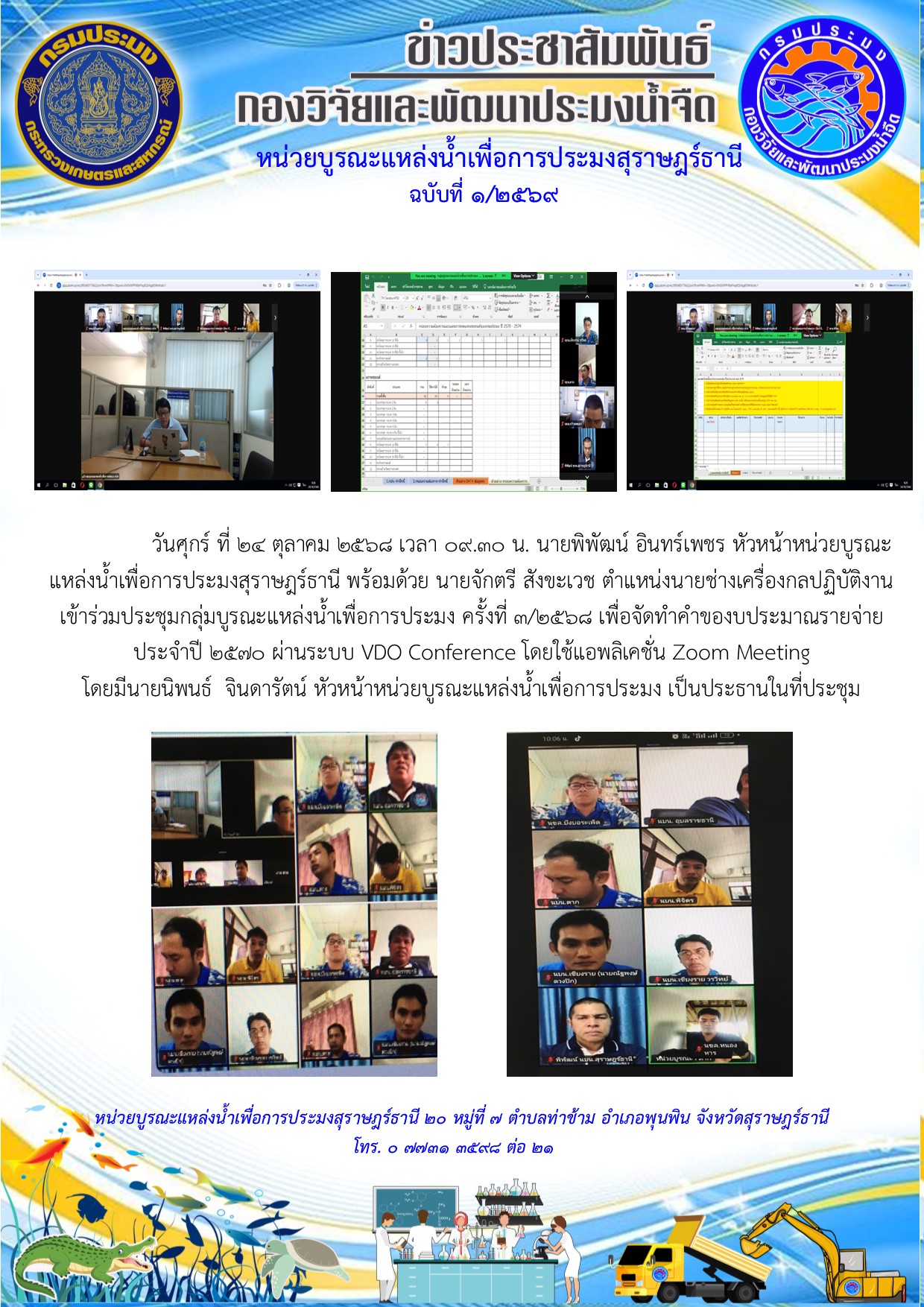 วันศุกร์ ที่ 24 ตุลาคม 2568 เวลา 09.30 น. นายพิพัฒน์ อินทร์เพชร หัวหน้าหน่วยบูรณะแหล่งน้ำเพื่อการประมงสุราษฎร์ธานี พร้อมด้วย นายจักตรี สังขะเวช ตำแหน่งนายช่างเครื่องกลปฏิบัติงาน เข้าร่วมประชุมกลุ่มบูรณะแหล่งน้ำเพื่อการประมง ครั้งที่ 3/2568 เพื่อจัดทำคำของบประมาณรายจ่ายประจำปี 2570 ผ่านระบบ VDO Conference    โดยใช้แอพลิเคชั่น Zoom Meeting โดยมีนายนิพนธ์  จินดารัตน์ หัวหน้าหน่วยบูรณะแหล่งน้ำเพื่อการประมง เป็นประธานในที่ประชุม