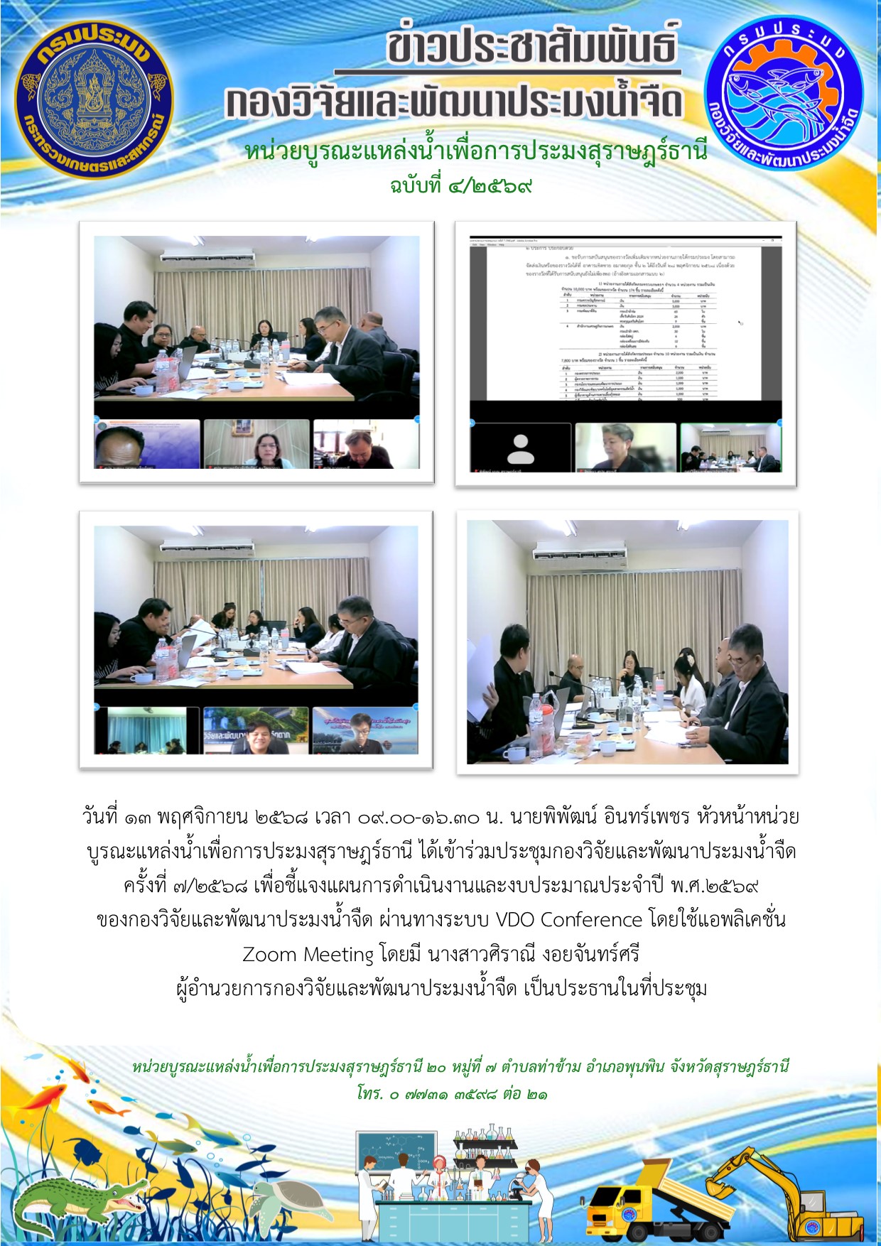 วันที่ 13 พฤศจิกายน 2568 เวลา 09.00-16.30 น. นายพิพัฒน์ อินทร์เพชร หัวหน้าหน่วยบูรณะแหล่งน้ำเพื่อการประมงสุราษฎร์ธานี ได้เข้าร่วมประชุมกองวิจัยและพัฒนาประมงน้ำจืด ครั้งที่ 7/2568 เพื่อชี้แจงแผนการดำเนินงานและงบประมาณประจำปี พ.ศ.2569 ของกองวิจัยและพัฒนาประมงน้ำจืด ผ่านทางระบบ VDO Conference โดยใช้แอพลิเคชั่น Zoom Meeting    โดยมี นางสาวศิราณี งอยจันทร์ศรี ผู้อำนวยการกองวิจัยและพัฒนาประมงน้ำจืด เป็นประธานในที่ประชุม