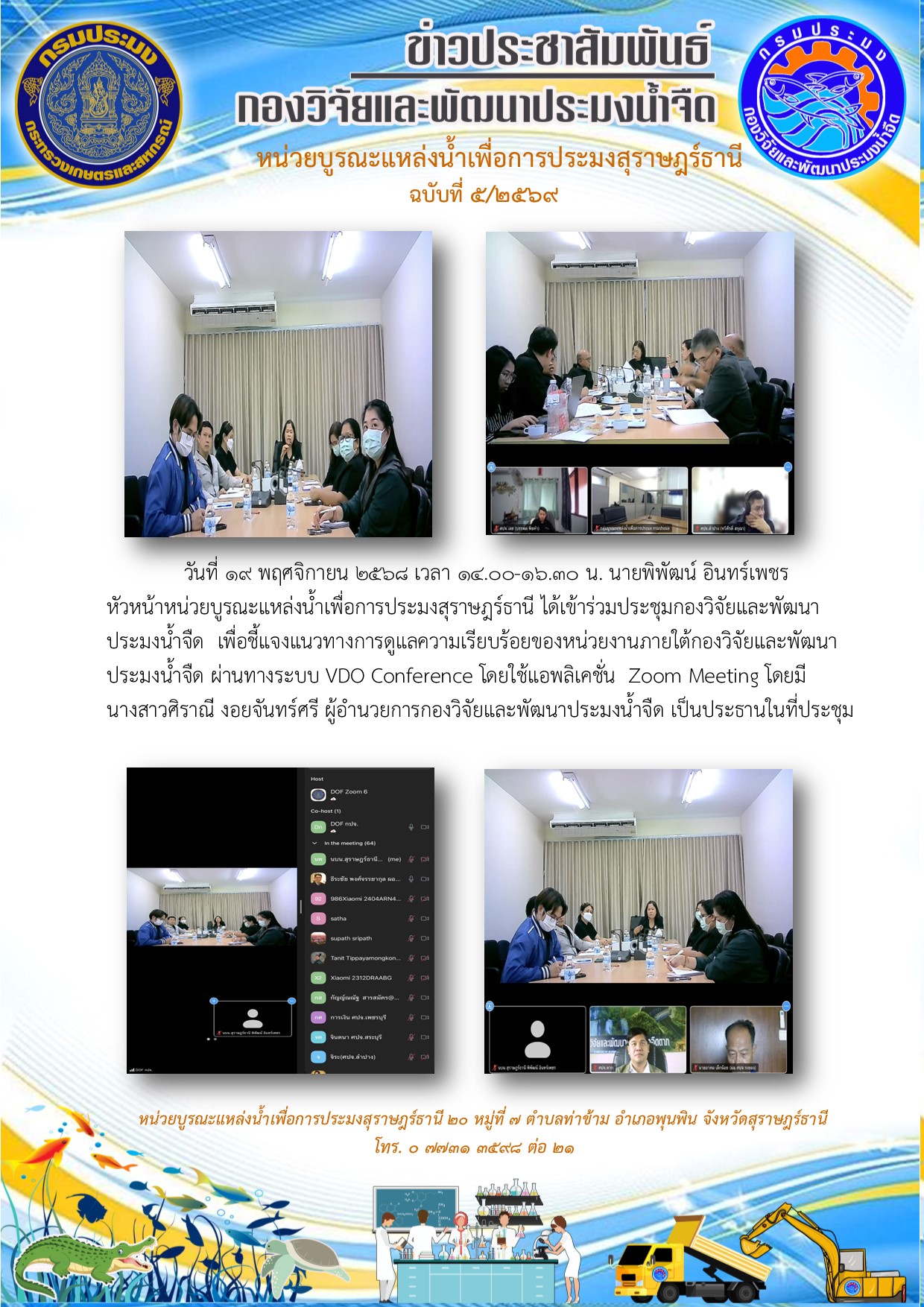 วันที่ 17-18 พฤศจิกายน 2568 เวลา 14.00-16.30 น. นายพิพัฒน์ อินทร์เพชร หัวหน้าหน่วยบูรณะแหล่งน้ำเพื่อการประมงสุราษฎร์ธานี ได้เข้าร่วมประชุมกองวิจัยและพัฒนาประมงน้ำจืด เพื่อชี้แจงแนวทางการดูแลความเรียบร้อยของหน่วยงานภายใต้กองวิจัยและพัฒนาประมงน้ำจืด ผ่านทางระบบ VDO Conference โดยใช้แอพลิเคชั่น Zoom Meeting โดยมี นางสาวศิราณี งอยจันทร์ศรี ผู้อำนวยการกองวิจัยและพัฒนาประมงน้ำจืด เป็นประธานในที่ประชุม