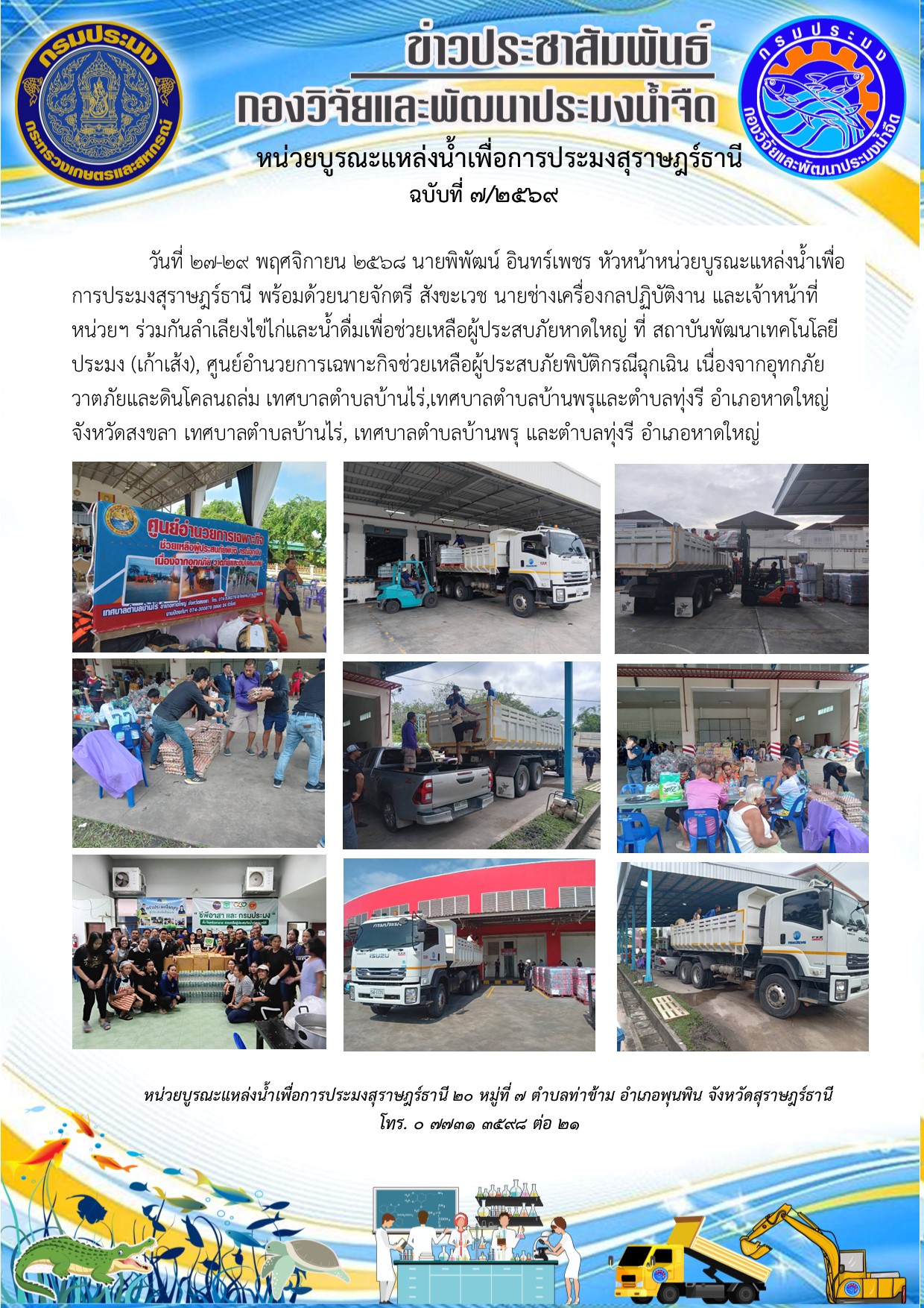 วันที่ 27-29 พฤศจิกายน 2568 นายพิพัฒน์ อินทร์เพชร หัวหน้าหน่วยบูรณะแหล่งน้ำเพื่อการประมงสุราษฎร์ธานี พร้อมด้วยนายจักตรี สังขะเวช นายช่างเครื่องกลปฏิบัติงาน และเจ้าหน้าที่หน่วยฯ ร่วมกันลำเลียงไข่ไก่และน้ำดื่มเพื่อช่วยเหลือผู้ประสบภัยหาดใหญ่ ที่ สถาบันพัฒนาเทคโนโลยีประมง (เก้าเส้ง), ศูนย์อำนวยการเฉพาะกิจช่วยเหลือผู้ประสบภัยพิบัติกรณีฉุกเฉิน เนื่องจากอุทกภัย วาตภัยและดินโคลนถล่ม เทศบาลตำบลบ้านไร่,เทศบาลตำบลบ้านพรุและตำบลทุ่งรี อำเภอหาดใหญ่ จังหวัดสงขลา เทศบาลตำบลบ้านไร่, เทศบาลตำบลบ้านพรุ และตำบลทุ่งรี อำเภอหาดใหญ่