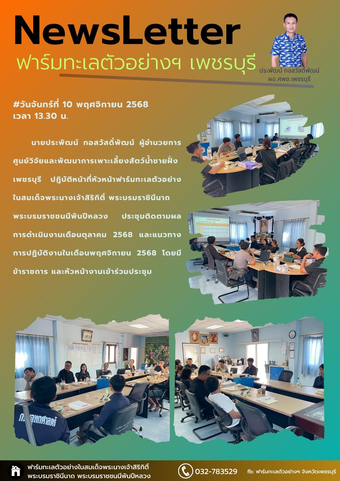 นายประพัฒน์ กอสวัสดิ์พัฒน์ ผู้อำนวยการศูนย์วิจัยและพัฒนาการเพาะเลี้ยงสัตว์น้ำชายฝั่งเพชรบุรี ปฎิบัติหน้าที่หัวหน้าฟาร์มทะเลตัวอย่างในสมเด็จพระนางเจ้าสิริกิติ์ พระบรมราชินีนาถ พระบรมราชชนนีพันปีหลวงประชุมติดตามผลการดำเนินงาน เดือนตุลาคม 2568 และแนวทางการปฏิบัติงานในเดือนพฤศจิกายน 2568 โดยมีข้าราชการ และหัวหน้างานเข้าร่วมประชุม