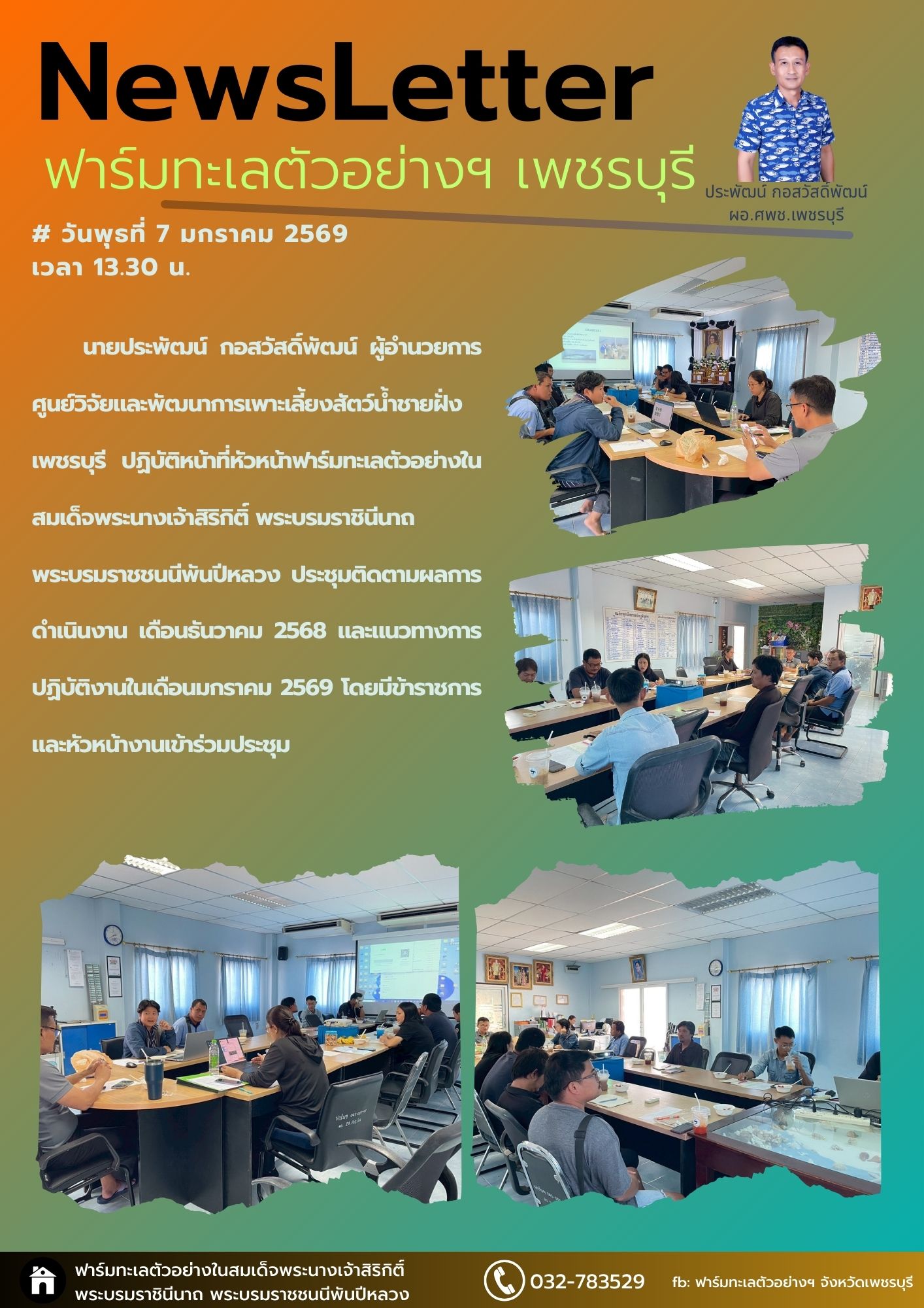 นายประพัฒน์ กอสวัสดิ์พัฒน์ ผู้อำนวยการศูนย์วิจัยและพัฒนาการเพาะเลี้ยงสัตว์น้ำชายฝั่งเพชรบุรี ปฎิบัติหน้าที่หัวหน้าฟาร์มทะเลตัวอย่างในสมเด็จพระนางเจ้าสิริกิติ์ พระบรมราชินีนาถ พระบรมราชชนนีพันปีหลวงประชุมติดตามผลการดำเนินงาน เดือนธันวาคม 2568 และแนวทางการปฏิบัติงานในเดือนมกราคม 2569 โดยมีข้าราชการ และหัวหน้างานเข้าร่วมประชุม
