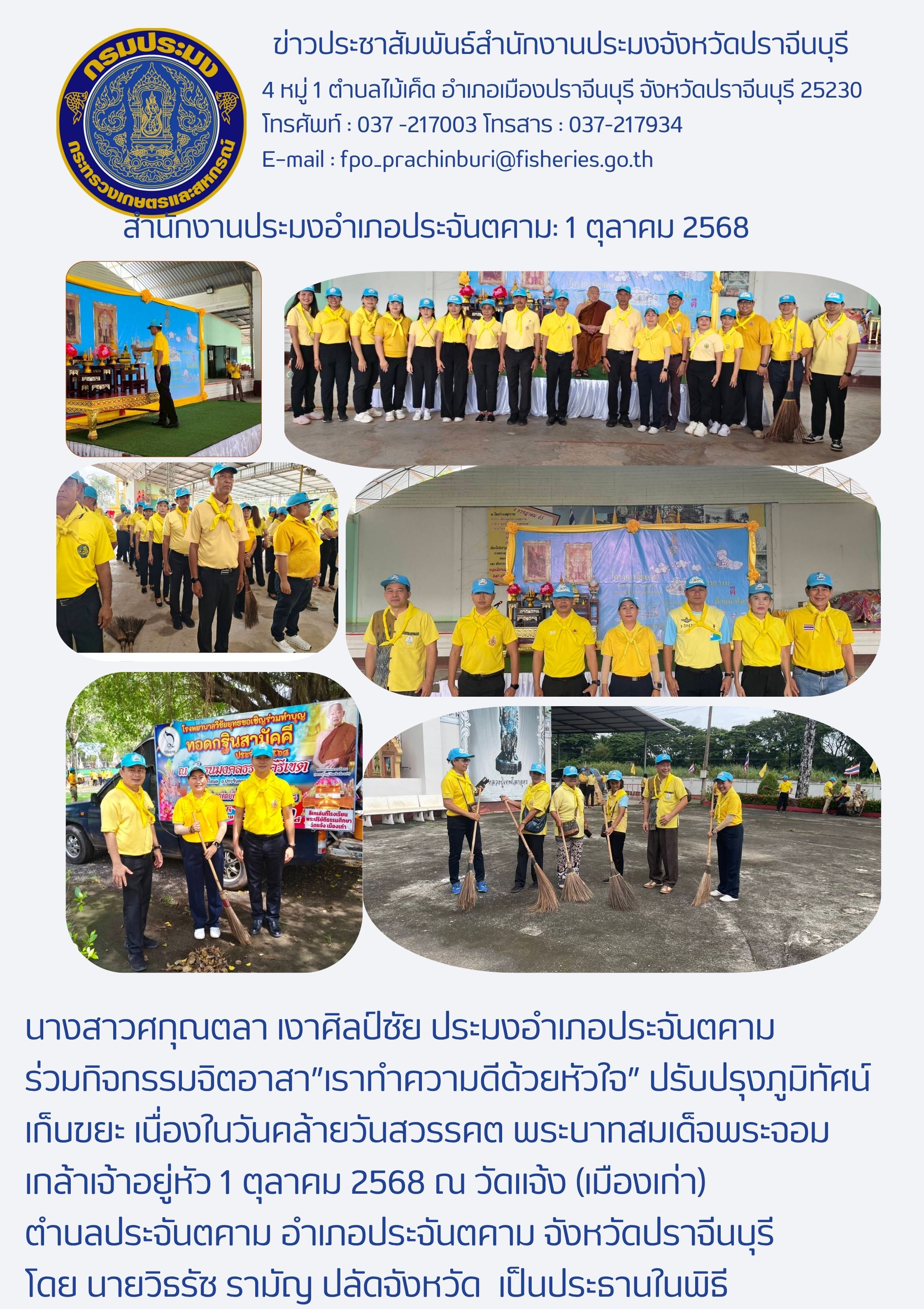 ข่าวประชาสัมพันธ์ สํานักงานประมงอำเภอประจันตคาม ร่วมกิจกรรมจิตอาสา"เราทำความดีด้วยหัวใจ” ปรับปรุงภูมิทัศน์ เก็บขยะ เนื่องในวันคล้ายวันสวรรคต พระบาทสมเด็จพระจอม เกล้าเจ้าอยู่หัว 1 ตุลาคม 2568 ณ วัดแจ้ง (เมืองเก่า) ตำบลประจันตคาม อำเภอประจันตคาม จังหวัดปราจีนบุรี
