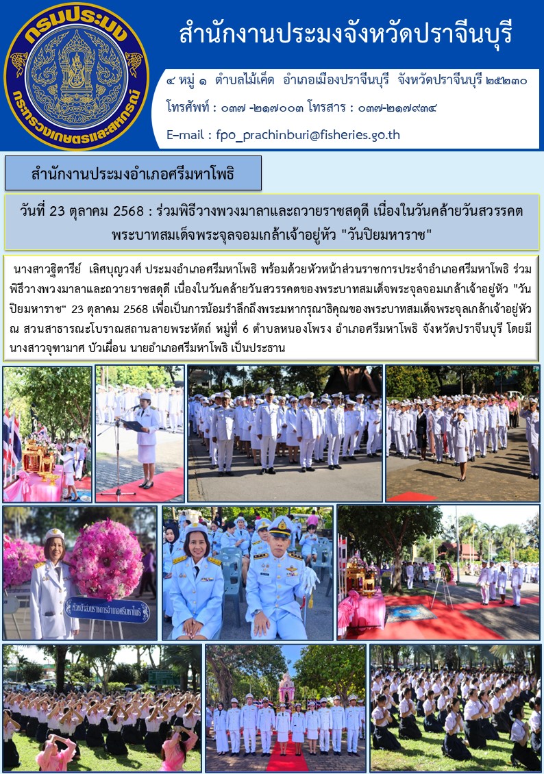 ข่าวประชาสัมพันธ์ สำนักงานประมงอำเภอศรีมหาโพธิ ร่วมพิธีวางพวงมาลาและถวายราชสดุดี เนื่องในวันคล้ายวันสวรรคต พระบาทสมเด็จพระจุลจอมเกล้าเจ้าอยู่หัว "วันปิยมหาราช