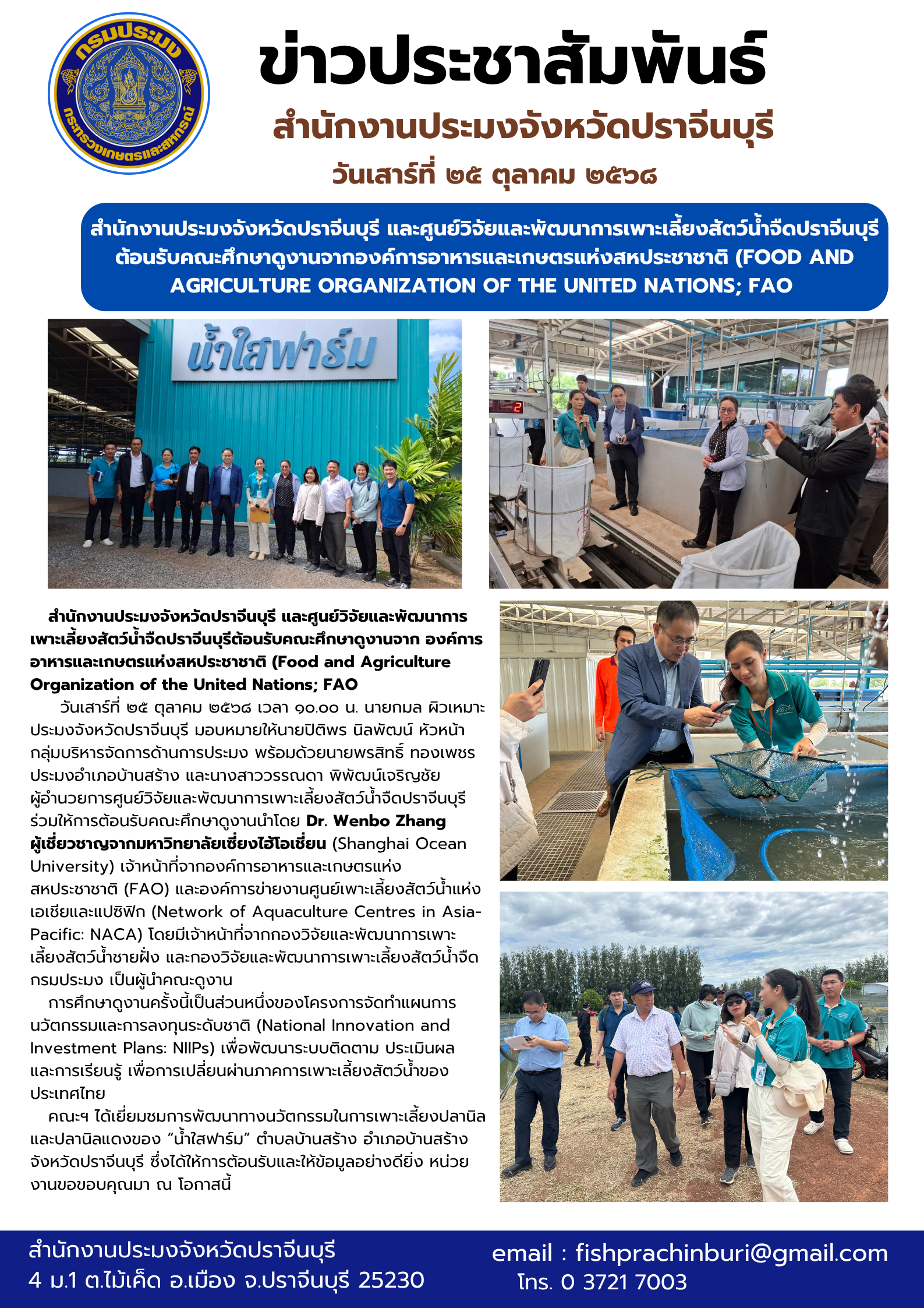 ข่าวประชาสัมพันธ์ สํานักงานประมงจังหวัดปราจีนบุรี และศูนย์วิจัยและพัฒนาการเพาะเลี้ยงสัตว์น้ำจืดปราจีนบุรี ต้อนรับคณะศึกษาดูงานจากองค์การอาหารและเกษตรแห่งสหประชาชาติ (FOOD AND AGRICULTURE ORGANIZATION OF THE UNITED NATIONS; FAO
