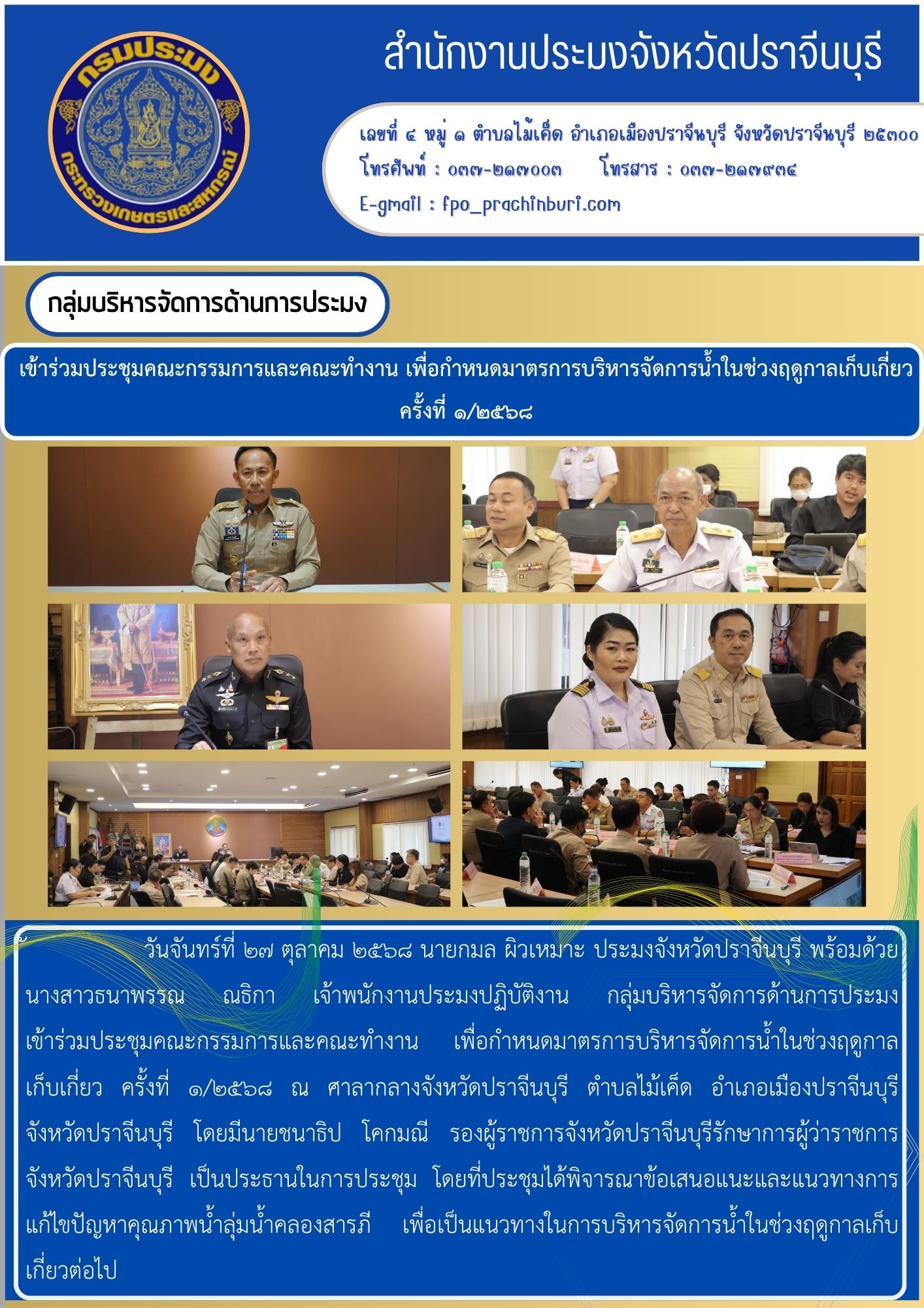ข่าวประชาสัมพันธ์ กลุ่มบริหารจัดการด้านการประมง เข้าร่วมประชุมคณะกรรมการและคณะทำงาน เพื่อกำหนดมาตรการบริหารจัดการน้ำในช่วงฤดูกาลเก็บเกี่ยว ครั้งที่ ๑/๒๕๖๘