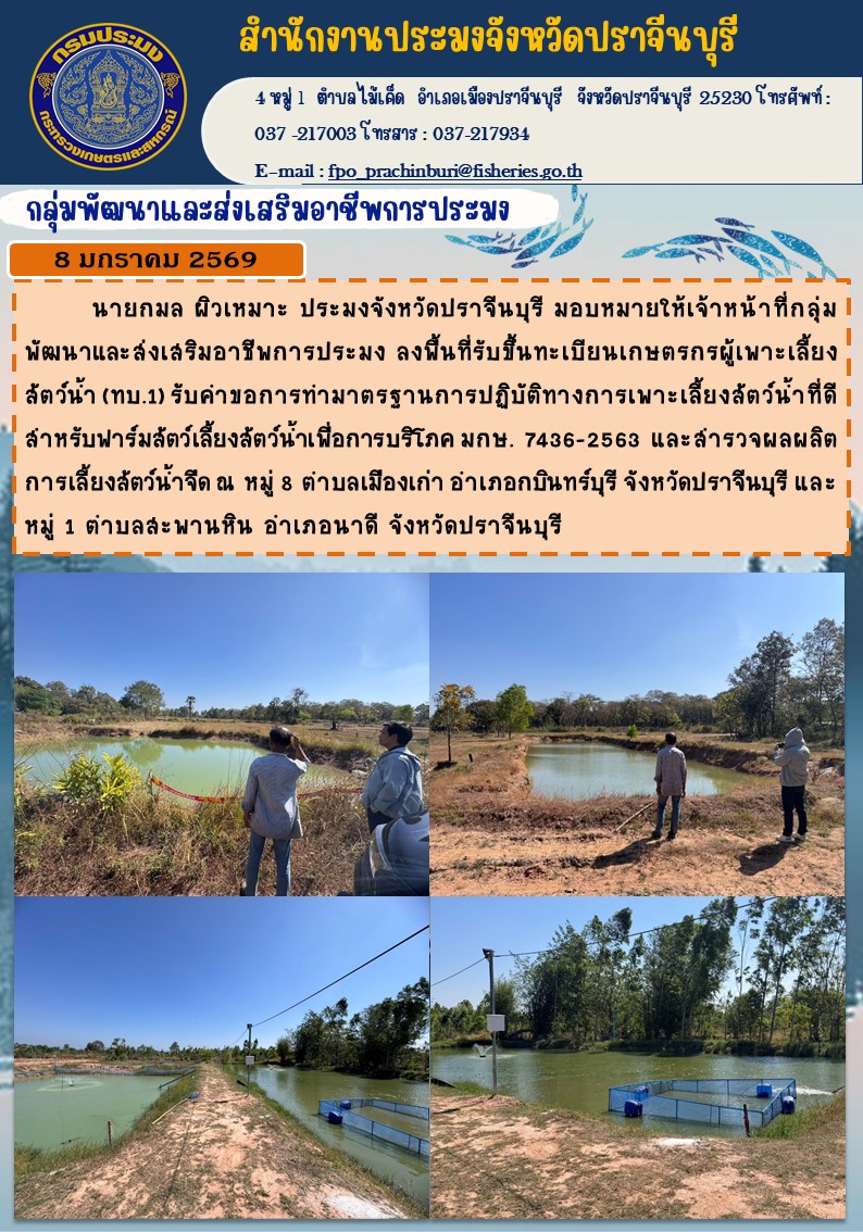 ข่าวประชาสัมพันธ์ กลุ่มพัฒนาและส่งเสริมอาชีพการประมง ลงพื้นที่รับขึ้นทะเบียนเกษตรกรผู้เพาะเลี้ยง | สัตว์น้ำ (ทบ.1) รับค่าขอการท่ามาตรฐานการปฏิบัติทางการเพาะเลี้ยงสัตว์น้ำที่ดี สาหรับฟาร์มสัตว์เลี้ยงสัตว์น้ำเพื่อการบริโภค มกษ. 7436-2563 และสารวจผลผลิต การเลี้ยงสัตว์น้ำจืด