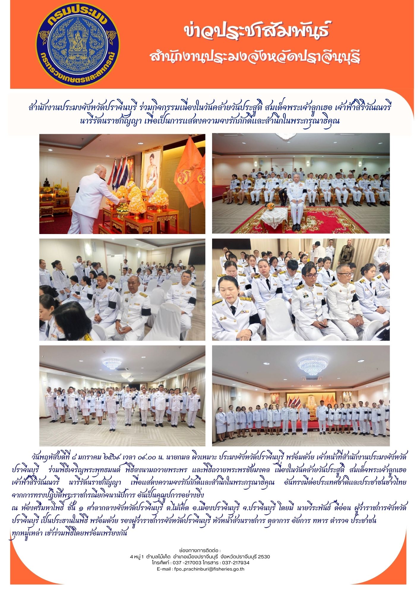ข่าวประชาสัมพันธ์ สำานักงานประมงจังหวัดปราจีนบุรี ร่วมกิจกรรมเนื่องในวันคล้ายวันประสูติ สมเด็จพระเจ้าลูกเธอ เจ้าฟ้าสิริวัณณวรี นารีรัตนราชกัญญา