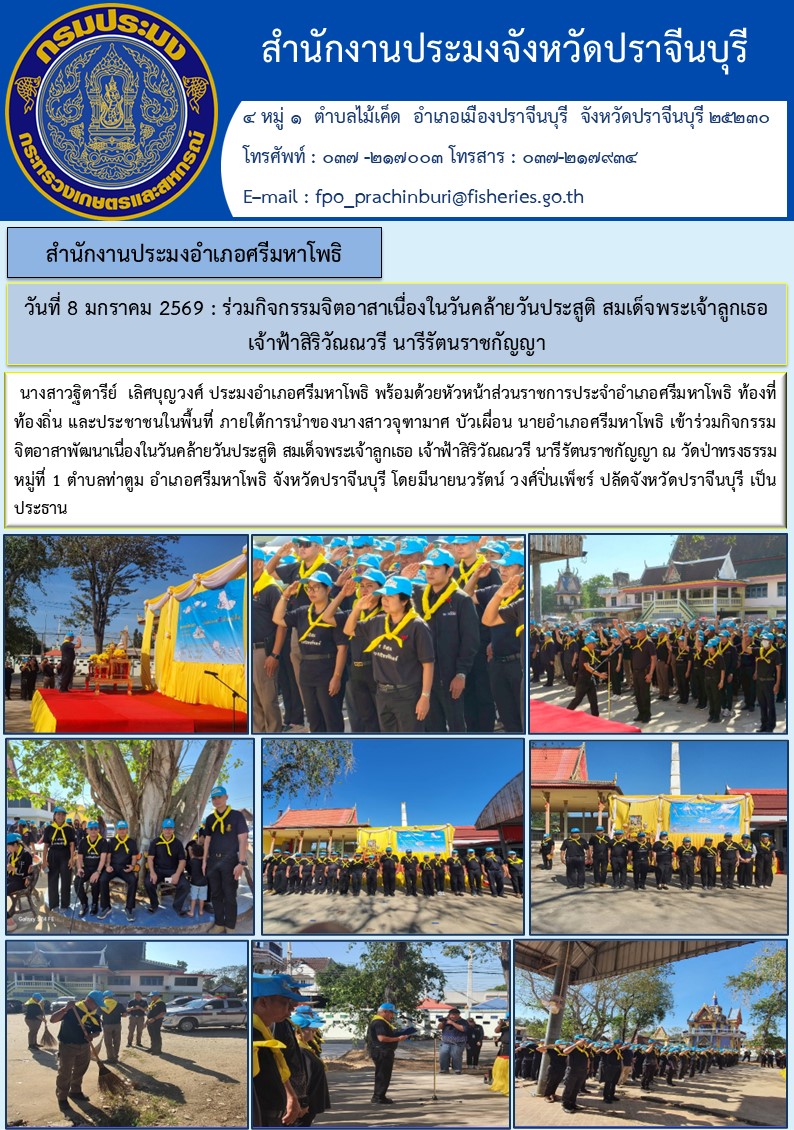 ข่าวประชาสัมพันธ์ สำนักงานประมงอำเภอศรีมหาโพธิ ร่วมกิจกรรมจิตอาสาเนื่องในวันคล้ายวันประสูติ สมเด็จพระเจ้าลูกเธอเจ้าฟ้าสิริวัณณวรี นารีรัตนราชกัญญา