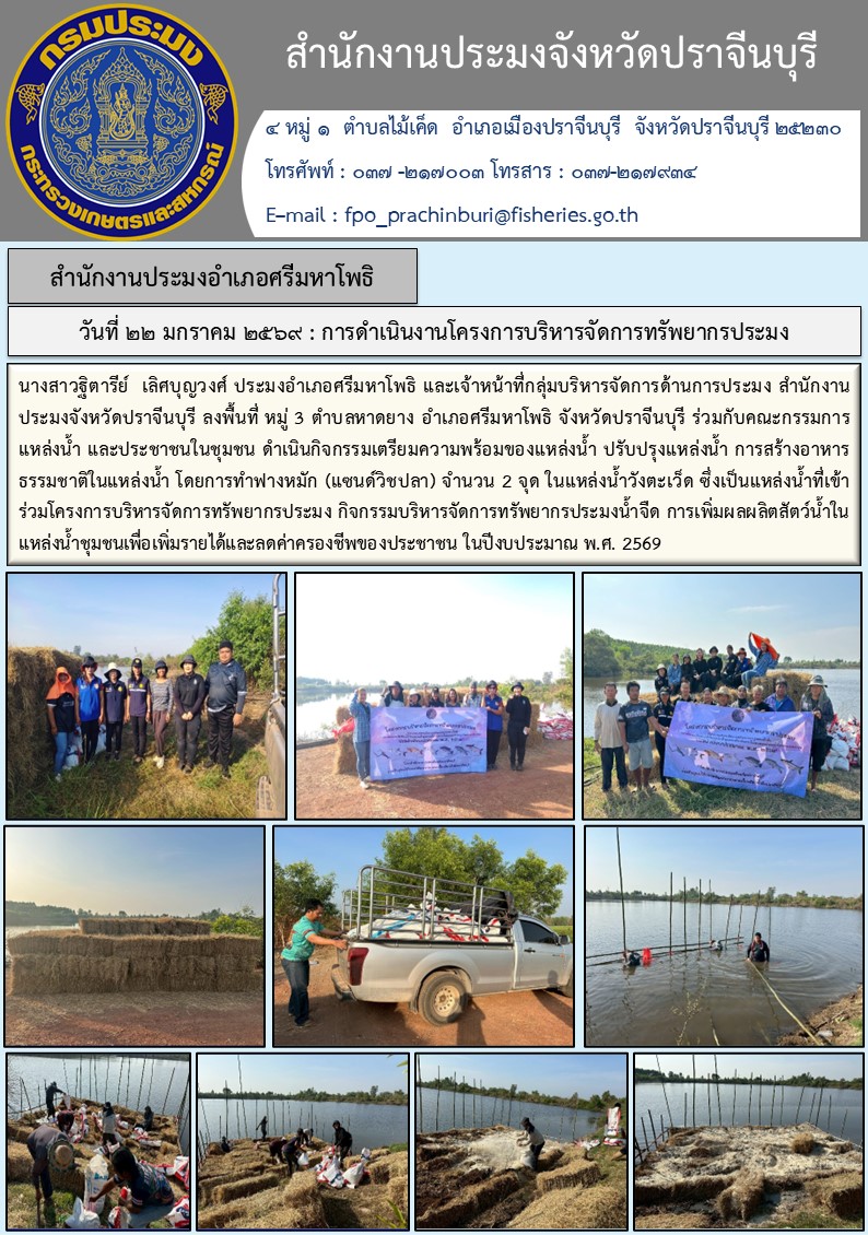 ข่าวประชาสัมพันธ์ สำนักงานประมงอำเภอศรีมหาโพธิ การดำเนินงานโครงการบริหารจัดการทรัพยากรประมง