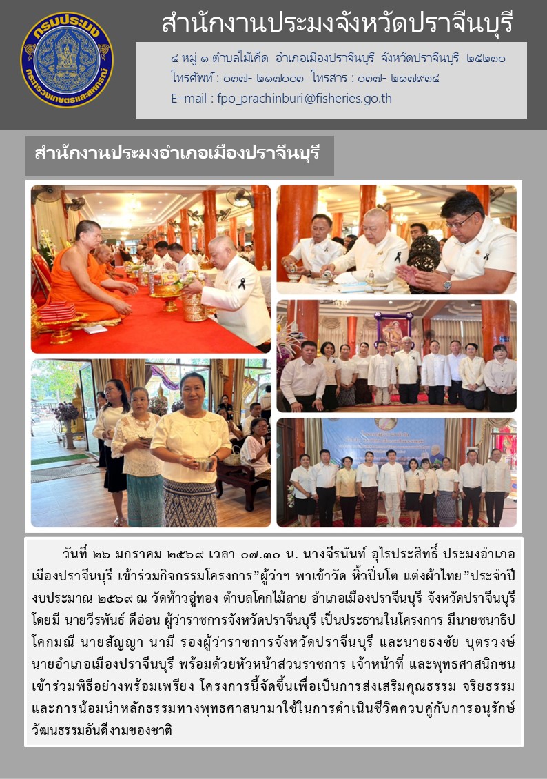 ข่าวประชาสัมพันธ์ สำนักงานประมงอำเภอเมืองปราจีนบุรี เข้าร่วมกิจกรรมโครงการ” ผู้ว่าฯ พาเข้าวัด หิ้วปิ่นโต แต่งผ้าไทย "ประจำปี งบประมาณ ๒๕๖๙