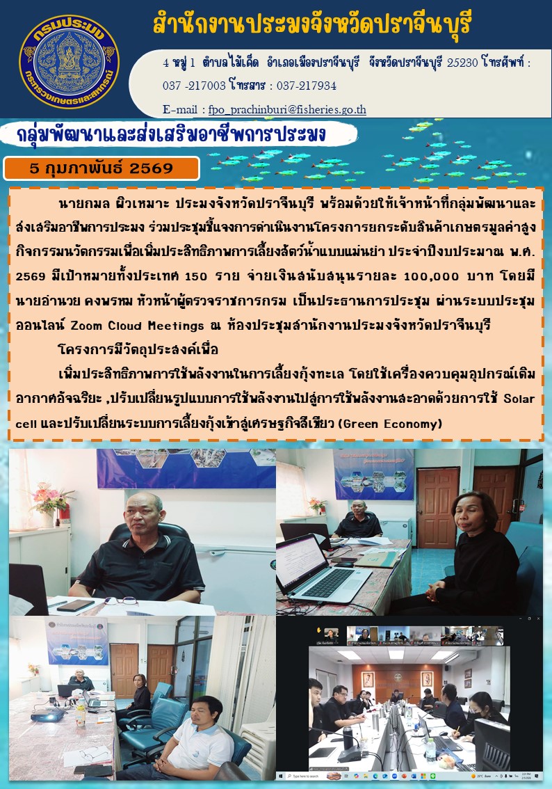 ข่าวประชาสัมพันธ์ กลุ่มพัฒนาและส่งเสริมอาชีพการประมง ร่วมประชุมชี้แจงการดำเนินงานโครงการยกระดับสินค้าเกษตรมูลค่าสูง กิจกรรมนวัตกรรมเพื่อเพิ่มประสิทธิภาพการเลี้ยงสัตว์น้ำแบบแม่นย่า ประจําปีงบประมาณ พ.ศ. 2569