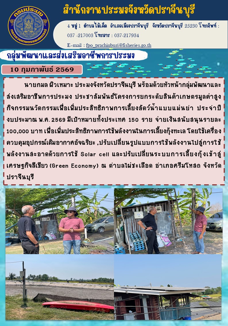 ข่าวประชาสัมพันธ์ กลุ่มพัฒนาและส่งเสริมอาชีพการประมง ประชาสัมพันธ์โครงการยกระดับสินค้าเกษตรมูลค่าสูง กิจกรรมนวัตกรรมเพื่อเพิ่มประสิทธิภาพการเลี้ยงสัตว์น้ำแบบแม่นย่า ประจําปี งบประมาณ พ.ศ. 2569