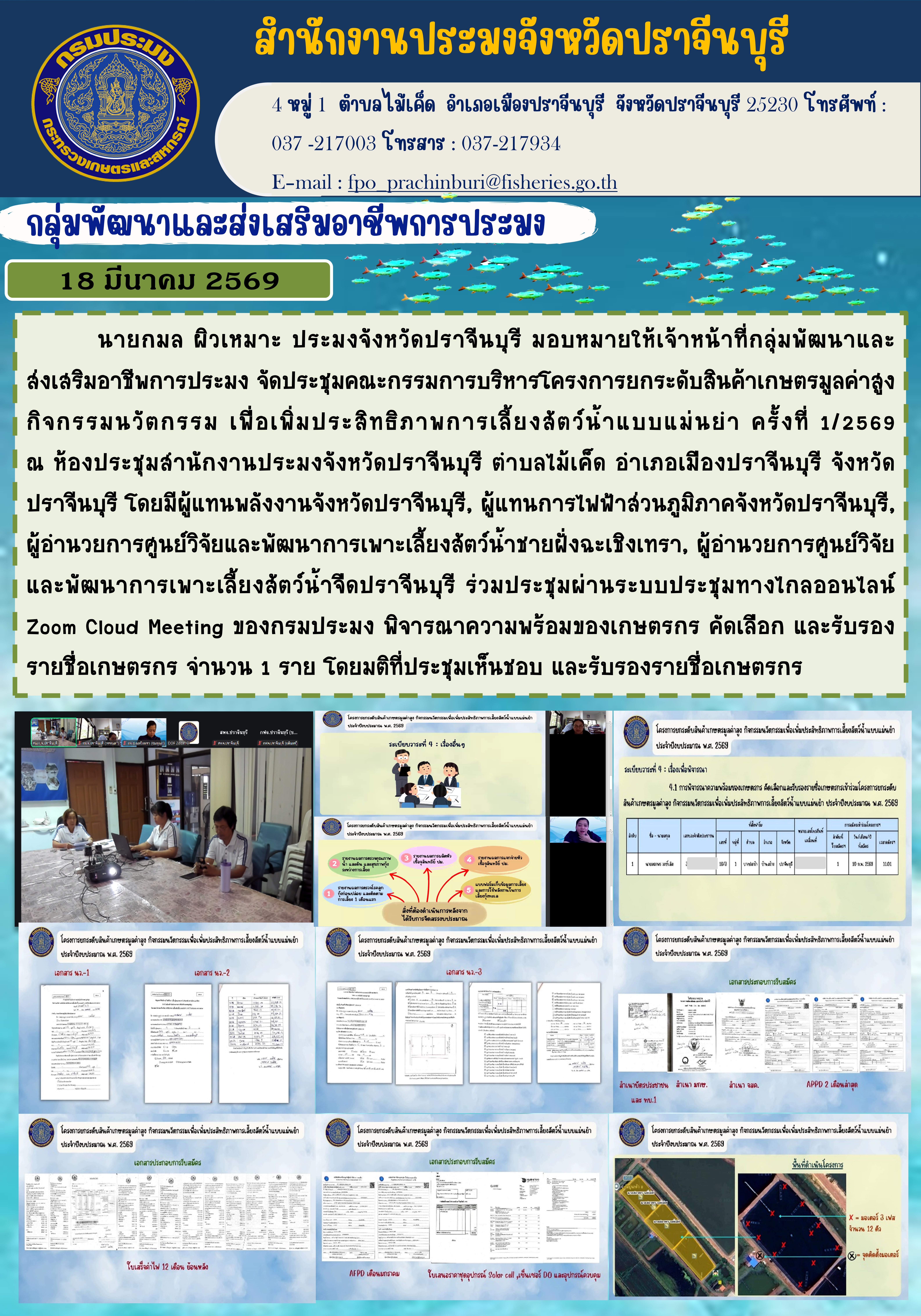 ข่าวประชาสัมพันธ์ กลุ่มพัฒนาและส่งเสริมอาชีพการประมง จัดประชุมคณะกรรมการบริหารโครงการยกระดับสินค้าเกษตรมูลค่าสูง กิจกรรมนวัตกรรม