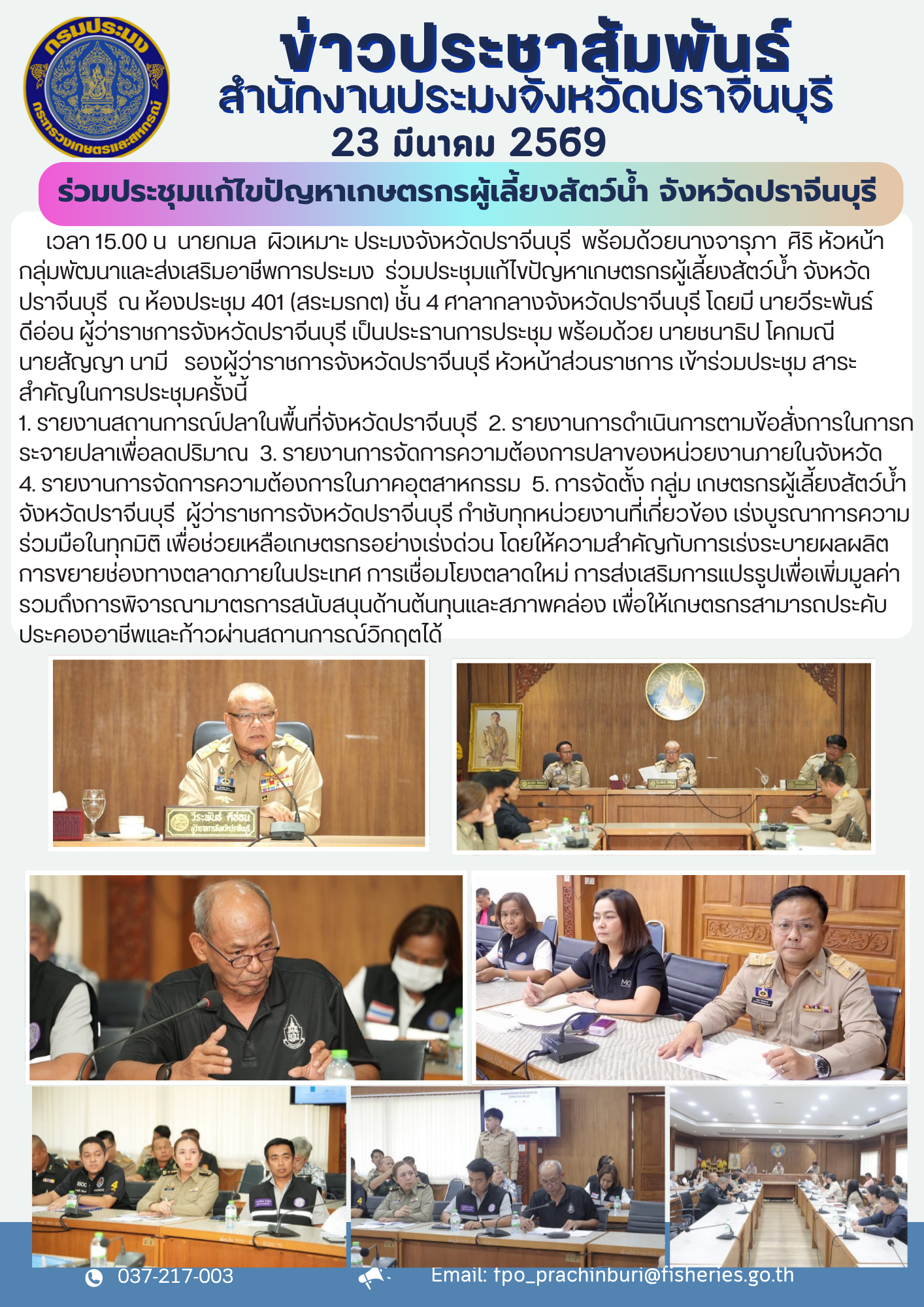 ข่าวประชาสัมพันธ์ ร่วมประชุมแก้ไขปัญหาเกษตรกรผู้เลี้ยงสัตว์น้ำ จังหวัดปราจีนบุรี