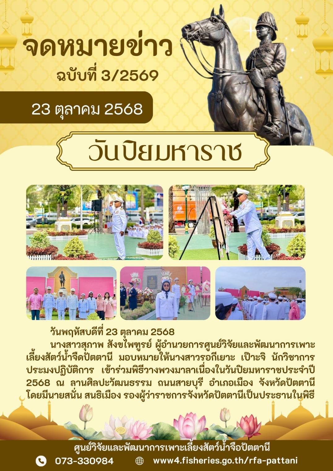 นางสาวสุภาพ สังขไพฑูรย์ ผู้อำนวยการศูนย์วิจัยและพัฒนาการเพาะเลี้ยงสัตว์น้ำจืดปัตตานี มอบหมายให้นางสาวรอกีเยาะ เป๊าะจิ นักวิชาการประมงปฏิบัติการ เข้าร่วมพิธีวางพวงมาลาเนื่องในวันปิยมหาราชประจำปี 2568 ณ ลานศิลปะวัฒนธรรม ถนนสายบุรี อำเภอเมือง จังหวัดปัตตานี