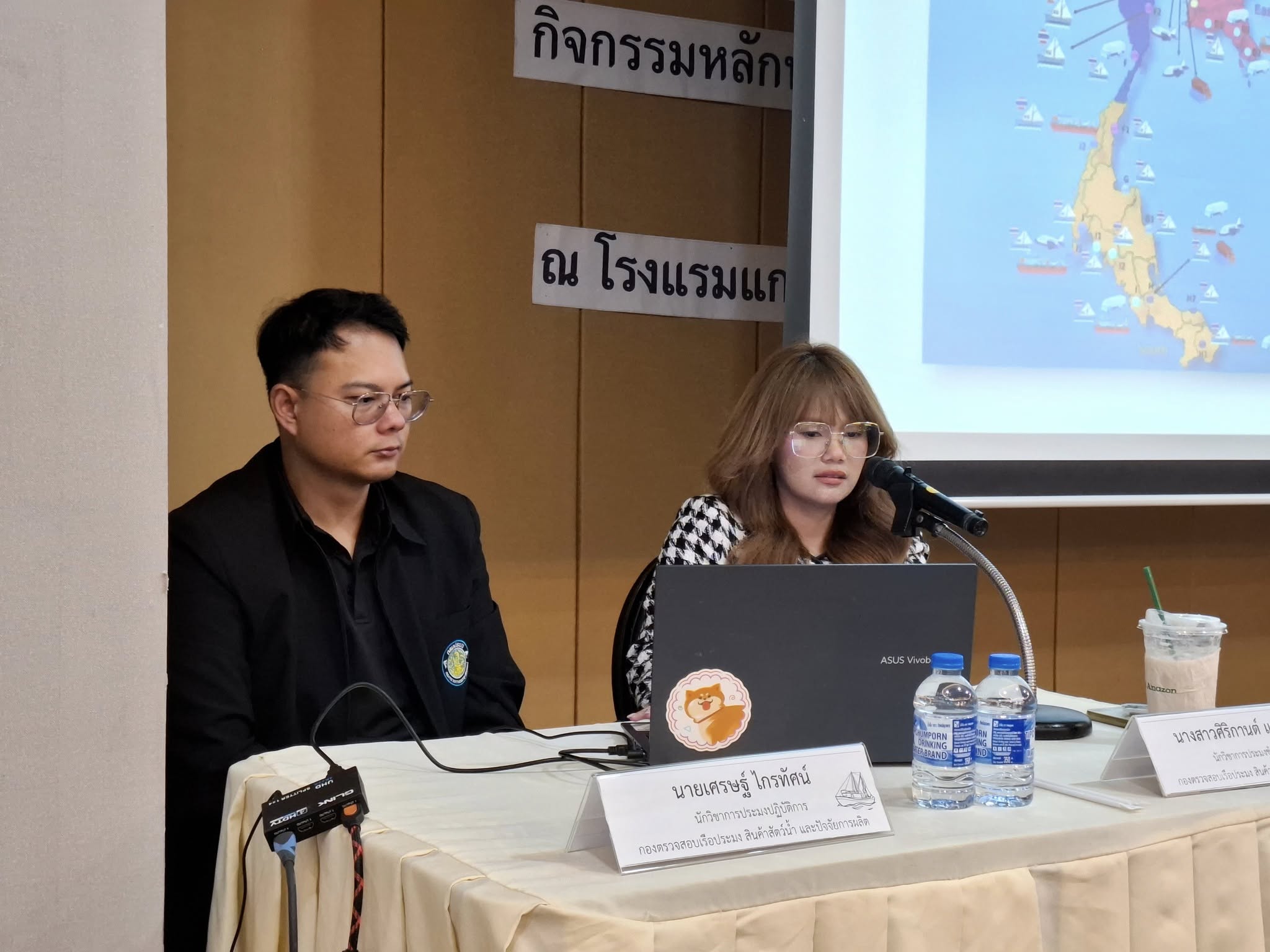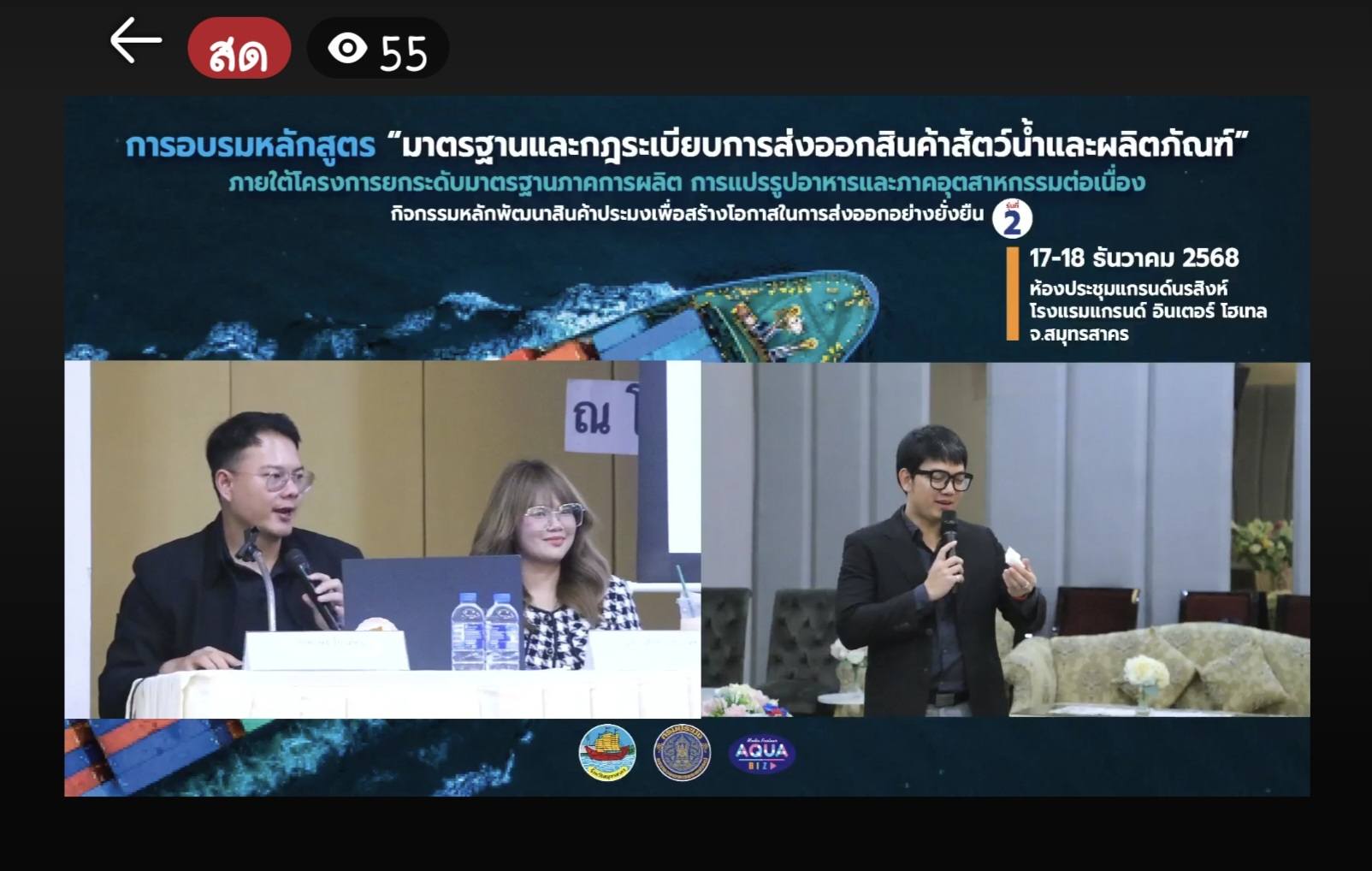 เมื่อวันพฤหัสบดีที่ 18 ธันวาคม 2568 เวลา 09.00 น. - 12.00 น. นางสาวศิริกานต์ แหยมอุบล นักวิชาการประมง (ชํานาญการ) นายเศรษฐ์ ไกรทัศน์ นักวิชาการประมง (ปฏิบัติการ) เจ้าหน้าที่กลุ่มควบคุมการนำเข้าส่งออกสัตว์น้ำ กองตรวจสอบเรือประมง สินค้าสัตว์น้ำ และปัจจัยการผลิต กรมประมง ร่วมเป็นวิทยากรการฝึกอบรมหลักสูตร "มาตรฐานและกฎระเบียบการส่งออกสินค้าสัตว์น้ำและผลิตภัณฑ์" รุ่นที่ 2 ระหว่างวันที่ 17-18 ธันวาคม 2568 ณ ห้องประชุมแกรนด์นรสิงห์ โรงแรมแกรนด์ อินเตอร์ โฮเทล ตำบลโคกขาม อำเภอเมืองสมุทรสาคร จังหวัดสมุทรสาคร จัดโดยสำนักงานประมงจังหวัดสมุทรสาคร ในส่วนของกองตรวจสอบเรือประมง สินค้าสัตว์น้ำ และปัจจัยการผลิต กรป. กรมประมง บรรยายเรื่องหลักเกณฑ์และขั้นตอนการนำเข้าส่งออกสัตว์น้ำและผลิตภัณฑ์ เพื่อให้ผู้ประกอบการด้านการประมงได้ทราบและเข้าใจขั้นตอน กฎระเบียบ และข้อบังคับ ด้านการส่งออกผลิตภัณฑ์